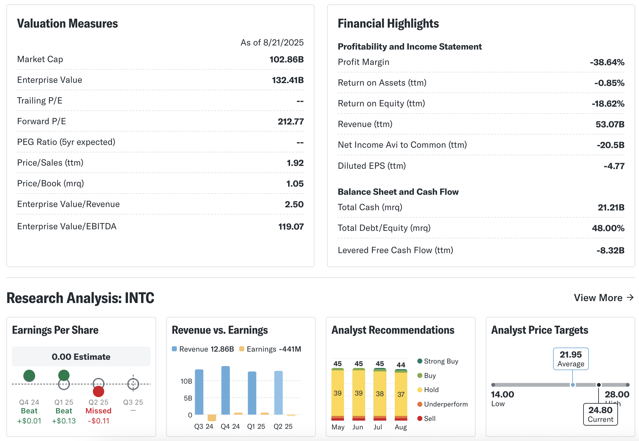 인텔은 유일하게 설계(Design)와 제조(Manufacturing)를 동시에 수행하는 미국 기업이라는 점에서 전략적 가치가 있습니다. 그러나 글로벌 반도체 산업이 파운드리(위탁생산) 중심으로 재편되면서, 인텔의 구조적 약점이 드러났습니다. 인텔 파운드리 사업은 최근 분기에만 32억 달러 손실을 기록했으며, 퀄컴·엔비디아 등 주요 고객 확보에도 실패했습니다. 결국 “TSMC와 삼성의 대안”이라는 구상은 아직 실현되지 못한 상태입니다. - 재무적 압박과 주가 추락