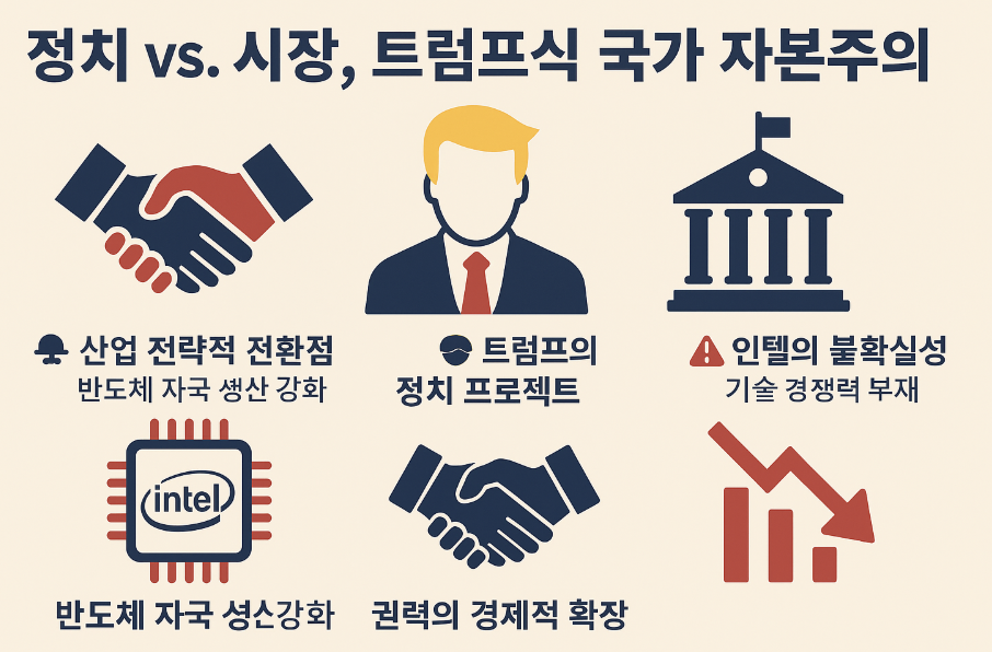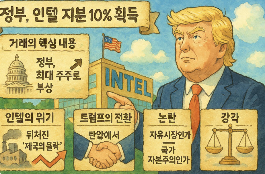 이번 합의는 미국 정부가 **단순 규제자(regulator)**를 넘어, **직접적 이해당사자(stakeholder)**로 기업 운영에 들어선 상징적인 사건입니다. 인텔은 이제 시장이 아닌 정치의 무대 위에 올라섰고, 이는 기회이자 위기입니다.