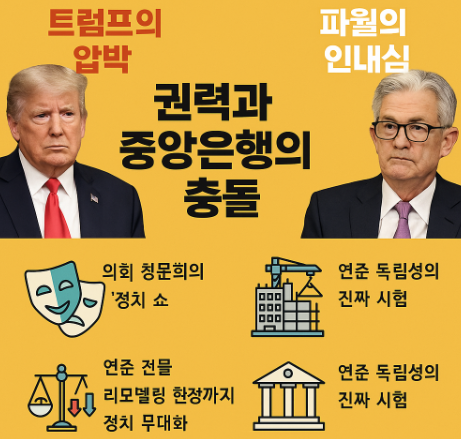👉 결국 이 사건은 단순한 건물 공사 문제가 아니라, 연준의 독립성을 흔들려는 정치적 연출 vs 데이터와 사실로 이를 방어하는 중앙은행장의 대립으로 상징화된 순간이라 할 수 있습니다.