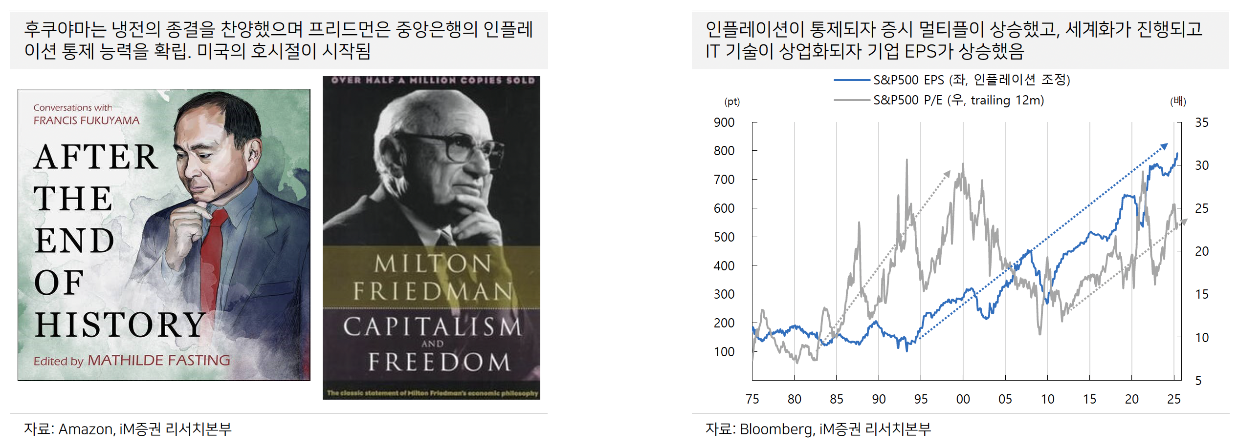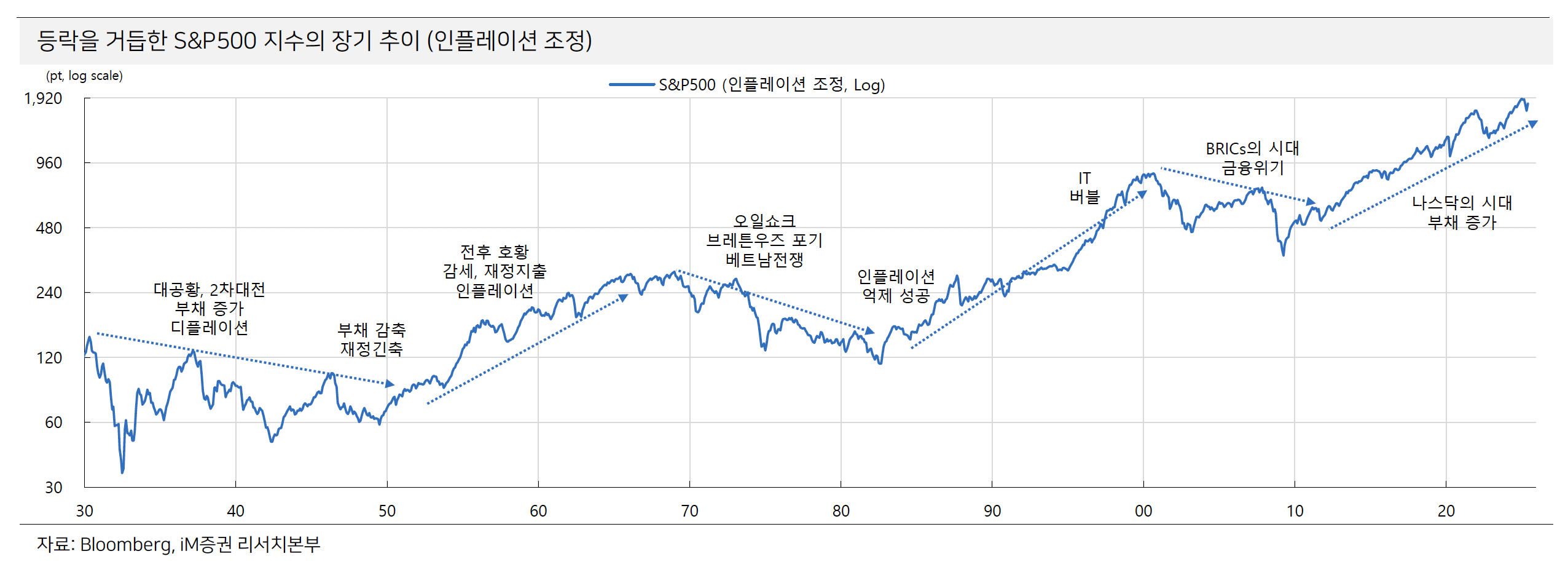 1980년대 이후 미국 증시는 디스인플레이션, 글로벌화, 기술진보, 패권 안정성이라는 조건 속에서 자산가격이 꾸준히 상승해 왔습니다.