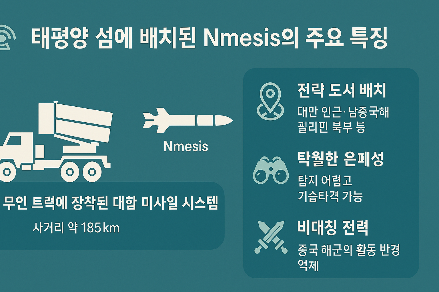 이러한 점에서 Nmesis는 단순한 미사일 시스템이 아닌, 현대전에서의 정보 은폐, 기동 전술, 비대칭 전력의 정수를 보여주는 미래형 무기라 할 수 있습니다.