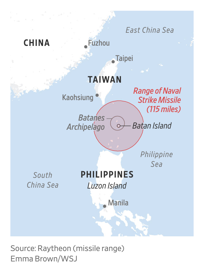 이 무기는 ‘해군-해병대 원정 선박차단 시스템(Naval Marine Expeditionary Ship Interdiction System)’이라는 공식 명칭을 갖고 있으며, 무인 트럭에 장착된 대함 미사일 발사대입니다. 위치적으로도 중국의 심기를 자극할 만한 장소에 배치되었죠. 바탄섬은 대만 남쪽 120마일 거리에 불과합니다.