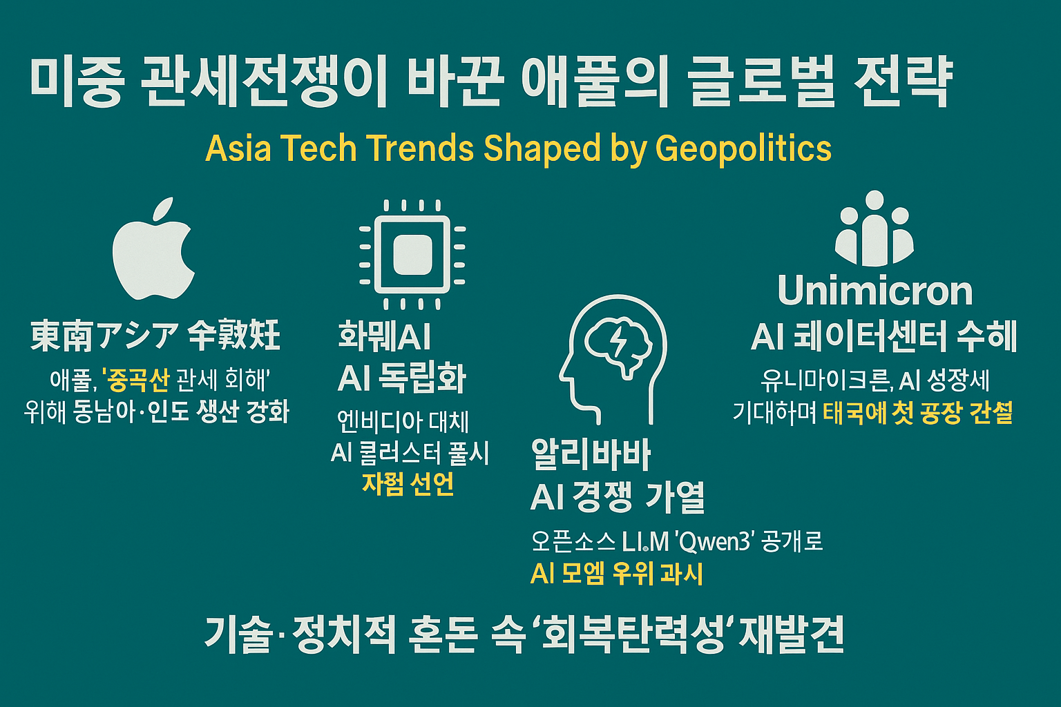 애플은 'Made in America'가 아닌 'Made in Southeast Asia'로 방향을 틀었고, 화웨이는 미국의 AI 칩 수출 통제에 대응해 자체 AI 클러스터를 출시했습니다. 여기에 대만 유니마이크론은 AI 데이터센터 수요를 기회로 보고 태국에 첫 생산기지를 구축 중이며, 알리바바는 오픈소스 대형 언어 모델(Qwen3)로 DeepSeek과 Baidu를 정면으로 겨냥하며 AI 주도권 확보에 나섰습니다.