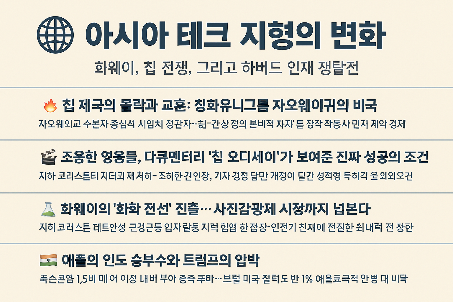 Zhao의 실패와 TSMC의 성공, 화웨이의 소재 투자와 샤오미의 칩 도전, 미국의 정책 변화에 대응하는 아시아 대학들의 민첩함. 이 모든 흐름 속에서 우리는 기술의 미래를 넘어서, 사람과 전략의 힘을 다시금 보게 됩니다.