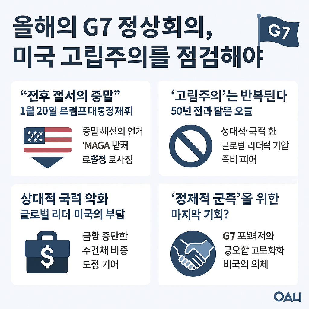 2025년의 세계는 분명히 다극화되고 있으며, 미국의 절대적 영향력은 감소했습니다. 그럼에도 불구하고, 미국은 여전히 국제 질서 유지의 핵심 축입니다. 만약 미국이 다시 ‘1933년의 길’을 선택한다면, 세계는 새로운 헤게몬 없이 깊은 불확실성의 시대를 맞이할 수 있습니다. 이번 G7 회담은 그 ‘함정’을 피할 수 있는 마지막 경고이자 기회일 수 있습니다.