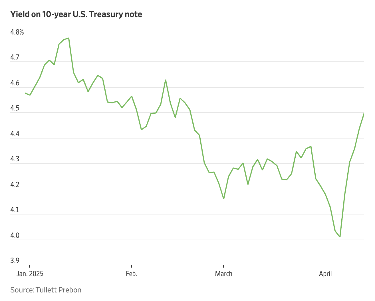 이번 주 가장 큰 이상 신호 중 하나는 미국 국채(Treasury)의 급격한 가격 하락과 그에 따른 금리 급등입니다. 10년물 금리는 4.5%에 근접하며 2001년 이후 최대 주간 상승폭을 기록했고, 30년물 금리는 1987년 이후 가장 가파르게 올랐습니다.