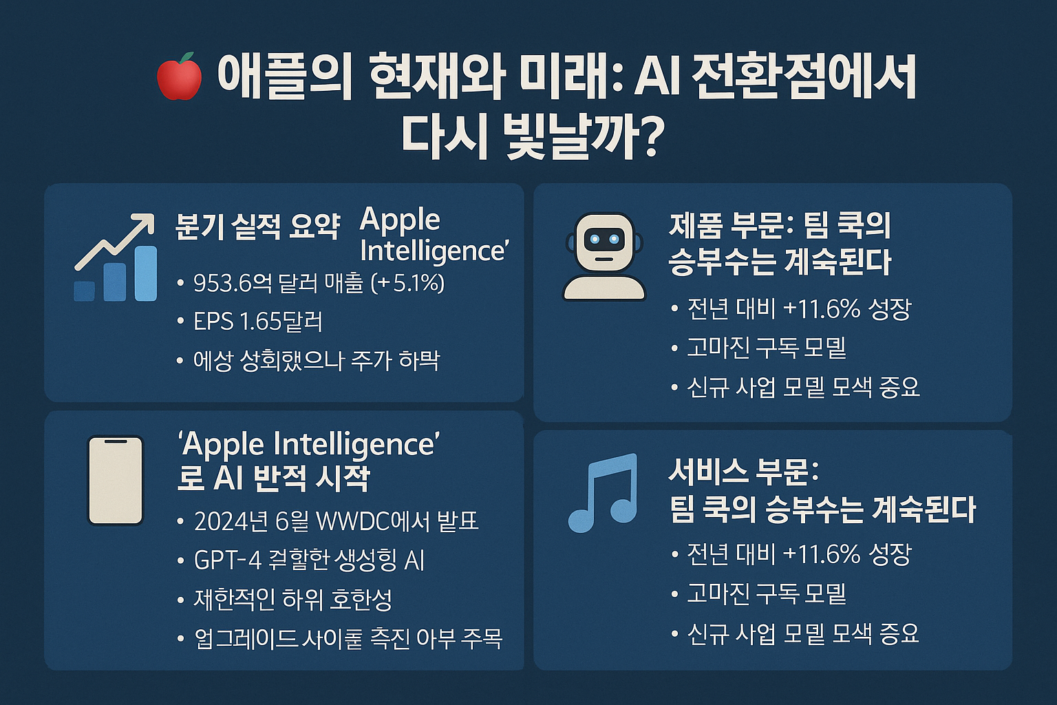 이번 분기 실적은 애플이 여전히 강력한 수익성, 안정적인 재무 구조, 그리고 높은 고객 충성도를 유지하고 있음을 보여줍니다. 하지만 동시에 최근 2년간의 성장 정체, 서비스 성장률 둔화, AI 경쟁에서의 후발 주자라는 점은 애플의 향후 10년을 결정지을 변곡점에 우리가 서 있음을 시사합니다.
