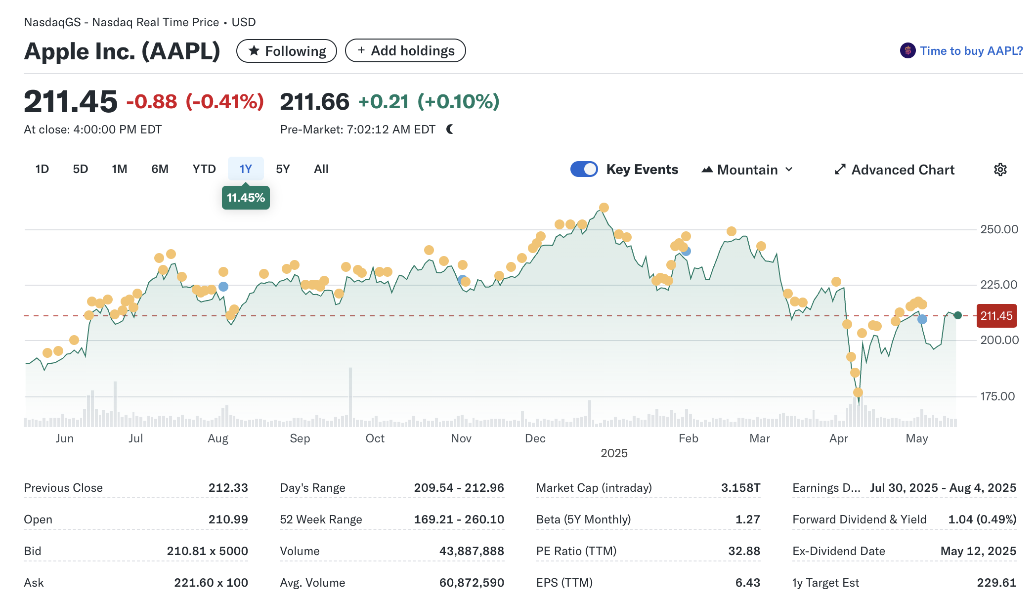 애플의 12개월 선행 PER은 28.2배로 업계 평균과 비슷한 수준이나, 마이크로소프트나 구글처럼 더 빠르게 성장하는 기업들에 비해 상대적으로 매력도가 떨어질 수 있습니다. 월가 평균 목표가는 229.61달러로 현재 주가(211.15달러) 대비 상승 여력이 존재하지만, 새로운 ‘성장 동력’ 확보 여부가 향후 주가를 좌우할 핵심입니다.
