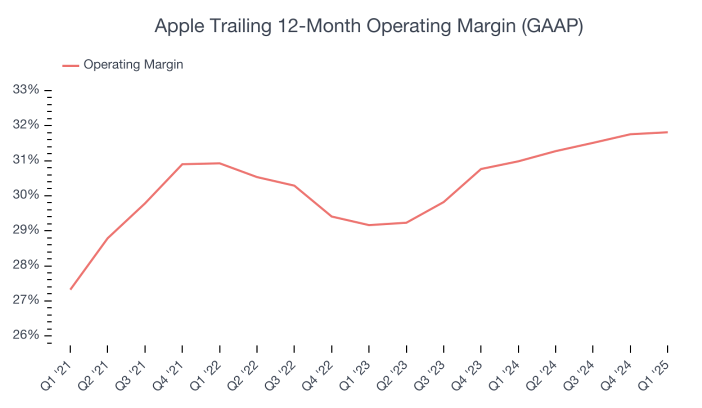 이 두 부문을 통합한 애플의 전체 평균 총마진은 43.9%, 2025년 1분기 기준으로는 **47.1%**에 달합니다. 이는 매출 100달러당 약 47달러가 남아 마케팅, R&D, 인건비, 일반 관리비 등에 재투자될 수 있다는 의미입니다. 또한 **영업이익률은 31%**로, 글로벌 하드웨어 기업 중 최상위권을 유지하고 있습니다.