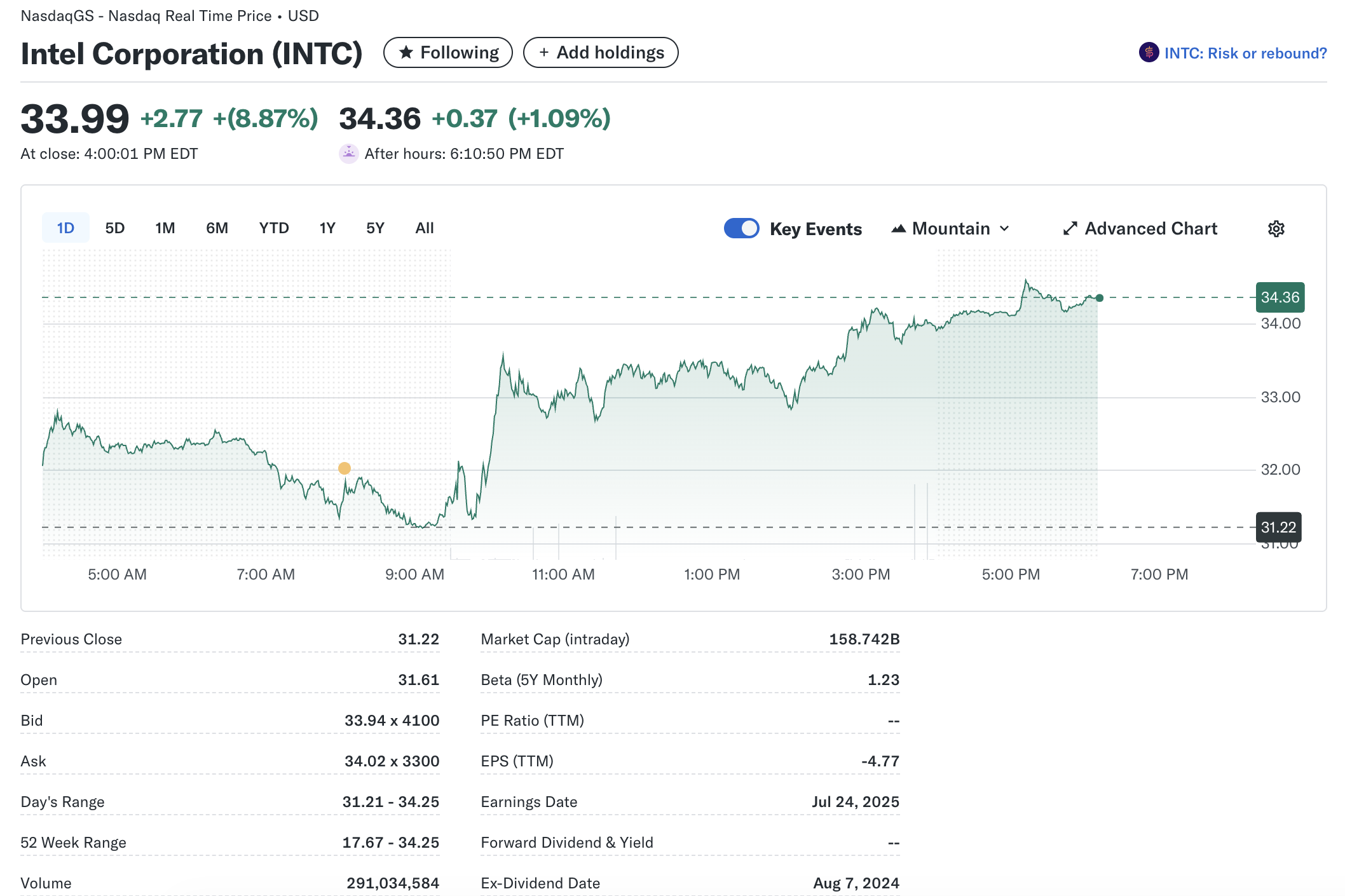 인텔이 애플에 전략적 투자를 타진했다는 블룸버그 보도 직후, 시장은 즉각적으로 ‘리레이팅 기대감’으로 움직였습니다. 보도 당일과 다음 날 새벽(미 동부 기준) **인텔 주가가 장중 급등세(+6~9% 내외)**를 보였고, 애플은 상대적으로 **소폭의 혼조(±1% 내외)**를 기록했습니다. 이는 “메가캐시 보유 기업의 전략 투자 → 인텔 턴어라운드 가속”이라는 스토리라인에 수급이 선반영된 전형적 사례로 해석됩니다. 양사 모두 공식 코멘트는 내놓지 않았고, 협상은 초기 단계로 알려졌습니다.