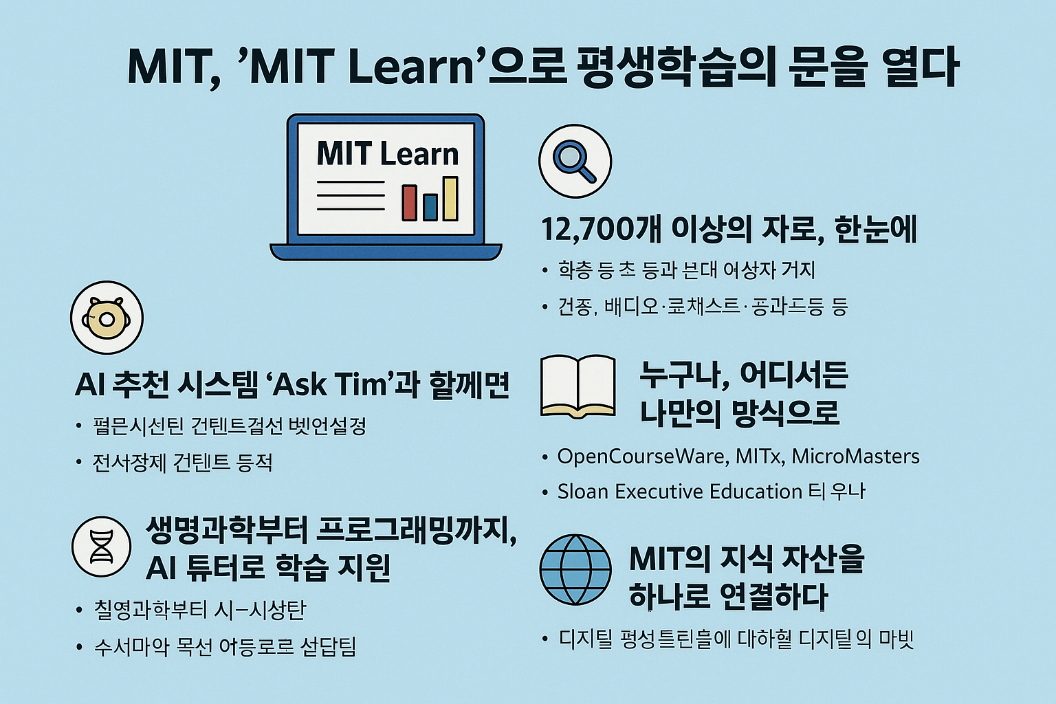 2001년, MIT는 세계 최초로 교육 콘텐츠를 전 세계 누구에게나 무료로 제공한 대학으로 역사에 기록됐습니다. 그리고 24년이 지난 지금, MIT는 또 하나의 혁신을 선보였습니다. 바로 AI 기반의 평생학습 플랫폼 **‘MIT Learn’**입니다. 이 플랫폼은 전 세계 학습자들이 MIT의 방대한 비학위 교육 자원을 보다 쉽게 탐색하고 활용할 수 있도록 설계되었습니다.