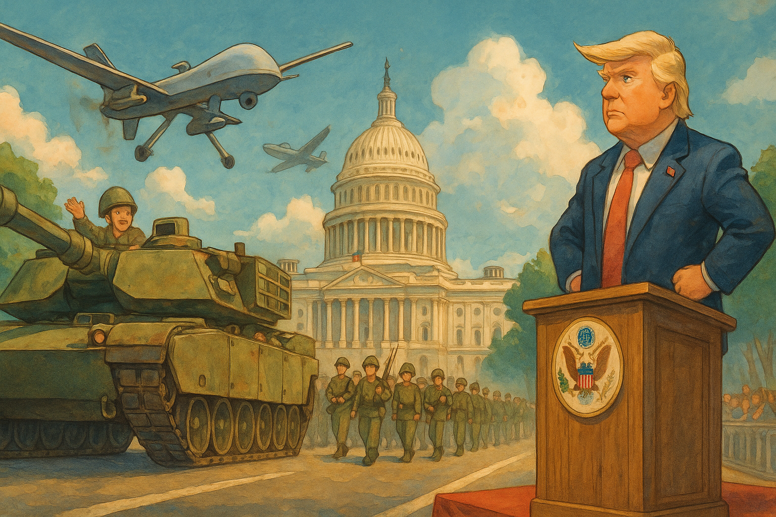 6월 14일, 워싱턴 D.C.의 중심을 가로지르는 군사 퍼레이드는 겉으로 보기엔 애국심과 군사력의 상징처럼 보였습니다. 트럼프 대통령이 “조금 자랑하고 싶다”고 말했듯이, 이번 행사는 미 육군 250주년을 기념하고 국민들에게 군의 존재감을 각인시키려는 목적을 담고 있었습니다. 전차, 장갑차, 전투복을 입은 수천 명의 병력이 질서 있게 행진하며 "힘 있는 미국"의 이미지를 시각적으로 각인시켰습니다.
