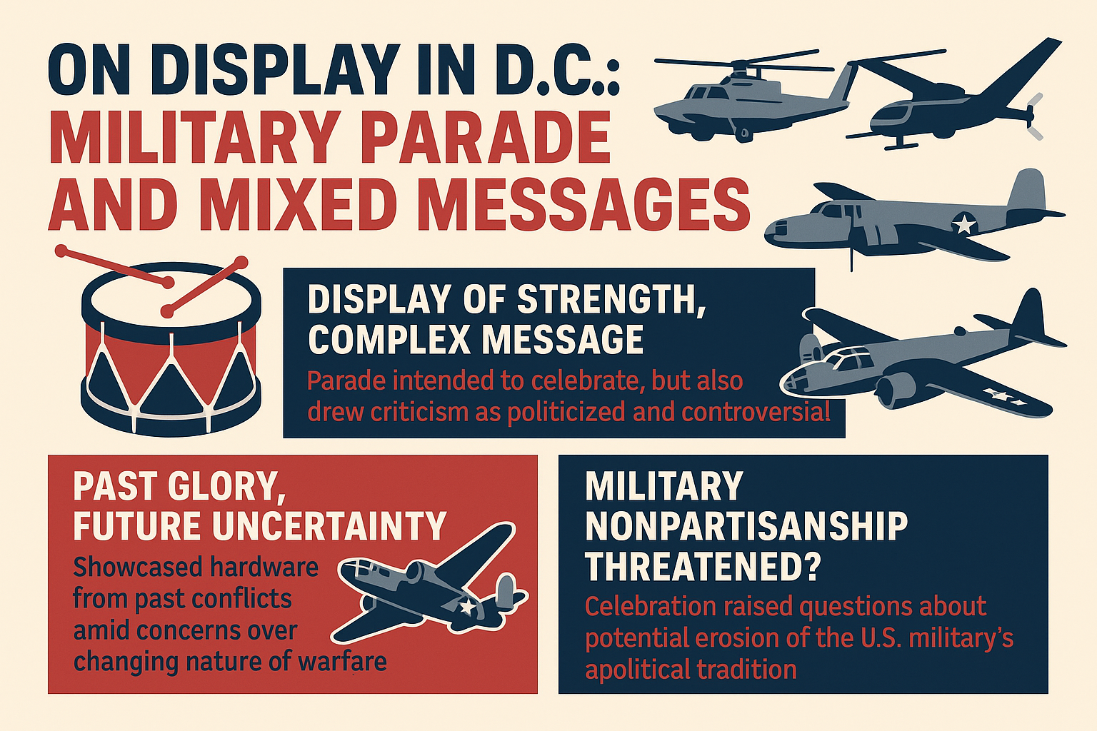 이번 퍼레이드는 군의 역사와 헌신을 기리는 기회가 될 수도, 또는 정치적 갈등을 확대하는 계기가 될 수도 있습니다.