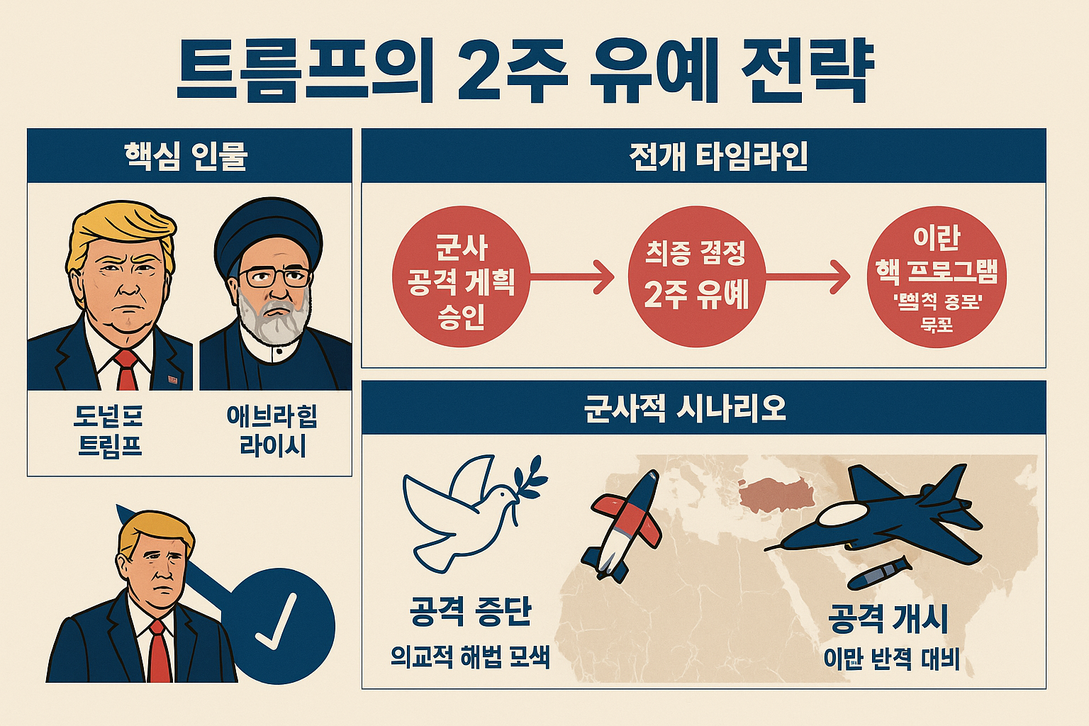 이번 블로그에서는 트럼프가 왜 2주라는 ‘정치적 시한폭탄’을 선택했는지, 이 유예의 의미가 무엇이며 앞으로의 시나리오가 어떻게 전개될 수 있는지를 군사적, 외교적, 정치적 관점에서 다각도로 분석해 보겠습니다.