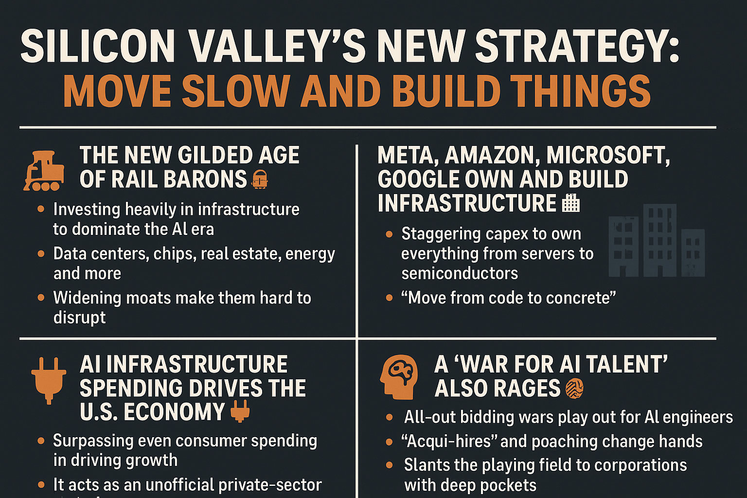 실리콘밸리가 변하고 있습니다. "Move fast and break things(빠르게 움직이고 부숴라)"라는 마크 저커버그의 2010년대 모토는 이제 한 물 갔습니다. 대신, 현재 빅테크는 철도, 철강 왕들이 그랬듯 인프라를 직접 소유하고, 천문학적 자금을 쏟아부으며 자신만의 ‘제국’을 구축하는 시대에 돌입했습니다.