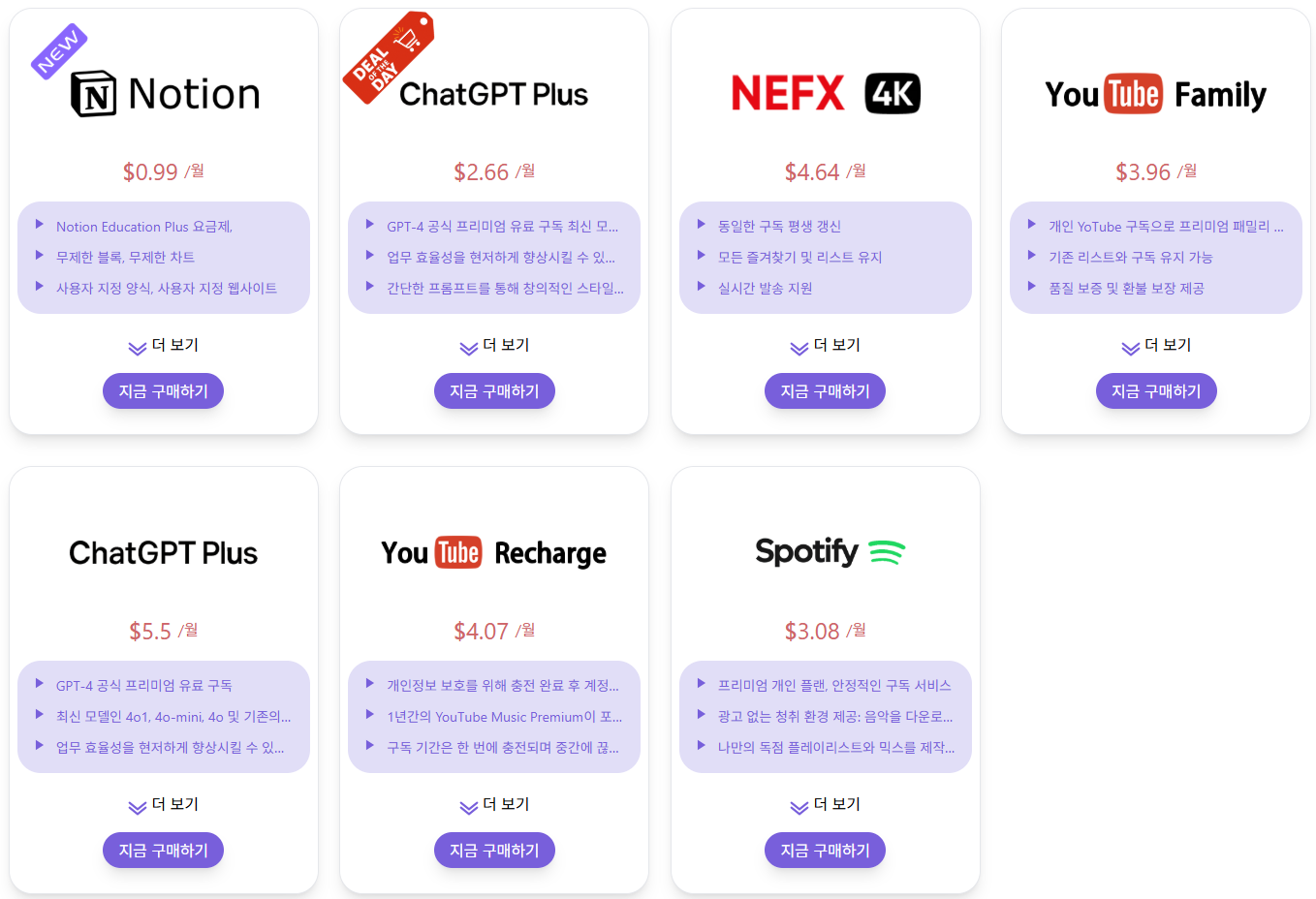 넷플릭스, 유튜브 프리미엄, ChatGPT Plus 같은 스트리밍 및 생산성 툴의 구독 요금을 보다 저렴하게 이용할 수 있게 만들어줍니다.