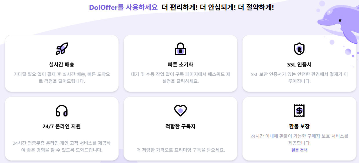 DOLOFFER는 단순히 저렴한 가격만을 내세우는 것이 아니라, 안전성·편의성·효율성까지 모두 갖춘 구독 플랫폼입니다. 이용자들이 믿고 사용할 수 있는 이유는 아래와 같은 핵심 기능 6가지 덕분입니다.
