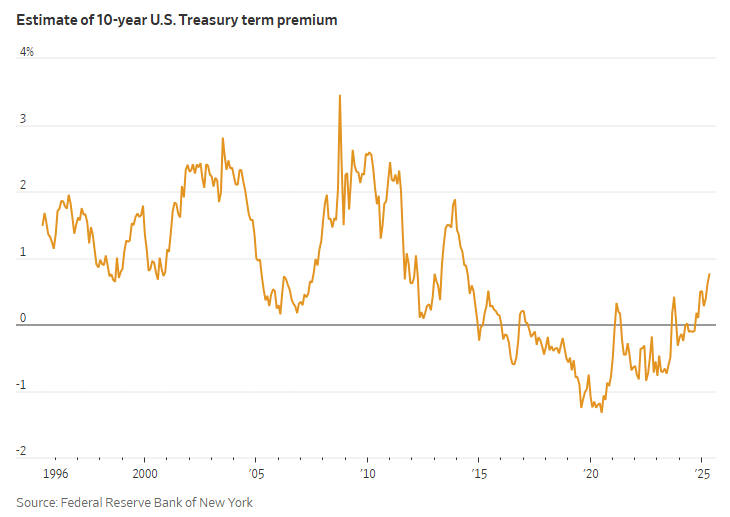 뉴욕 연방준비은행이 추정한 바에 따르면, 10년 만기 국채의 기간 프리미엄은 2014년 이후 최고 수준에 도달했습니다. 이는 단기적인 금리보다 재정 건전성에 대한 장기 우려가 더욱 커지고 있음을 보여주는 지표입니다.