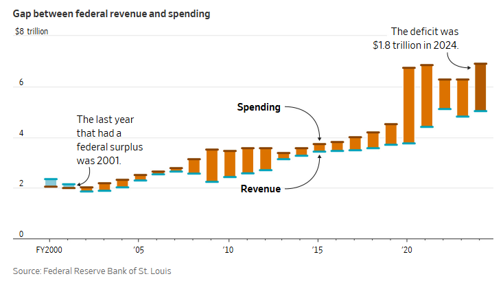 2024년 말 기준, 미국의 연간 재정적자는 약 1.8조 달러. GDP 대비 6%를 넘는 수치는 과거 글로벌 금융위기와 코로나19 시기에나 볼 수 있었던 심각한 수치입니다.