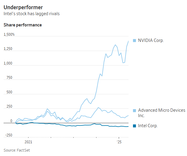인텔은 일부 제품 생산을 TSMC에 맡기는 방식으로 대응했지만, 이는 수익성을 떨어뜨렸고 투자자 신뢰도 약화시켰습니다. 지난 5년간 인텔 주가는 약 65% 하락한 반면, AMD는 2배 이상, TSMC는 4배, Nvidia는 무려 16배 상승했습니다.