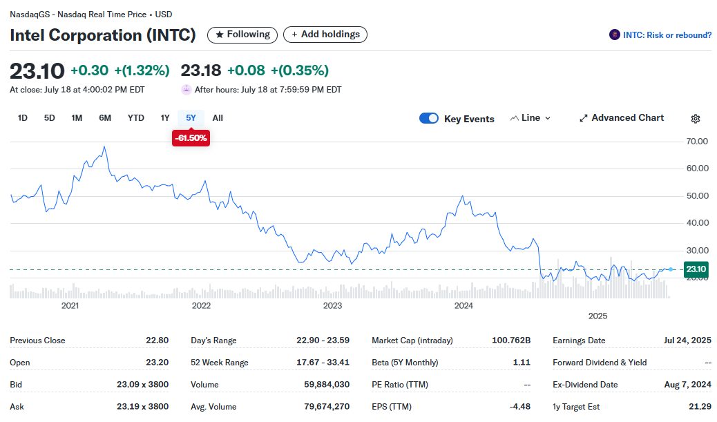 - 투자자 신뢰 하락: 기술 격차와 수익성 악화, 전략의 모호성 등으로 인해 인텔 주가는 지난 5년간 약 65% 급락하며 장기 투자자들의 실망을 사고 있습니다.