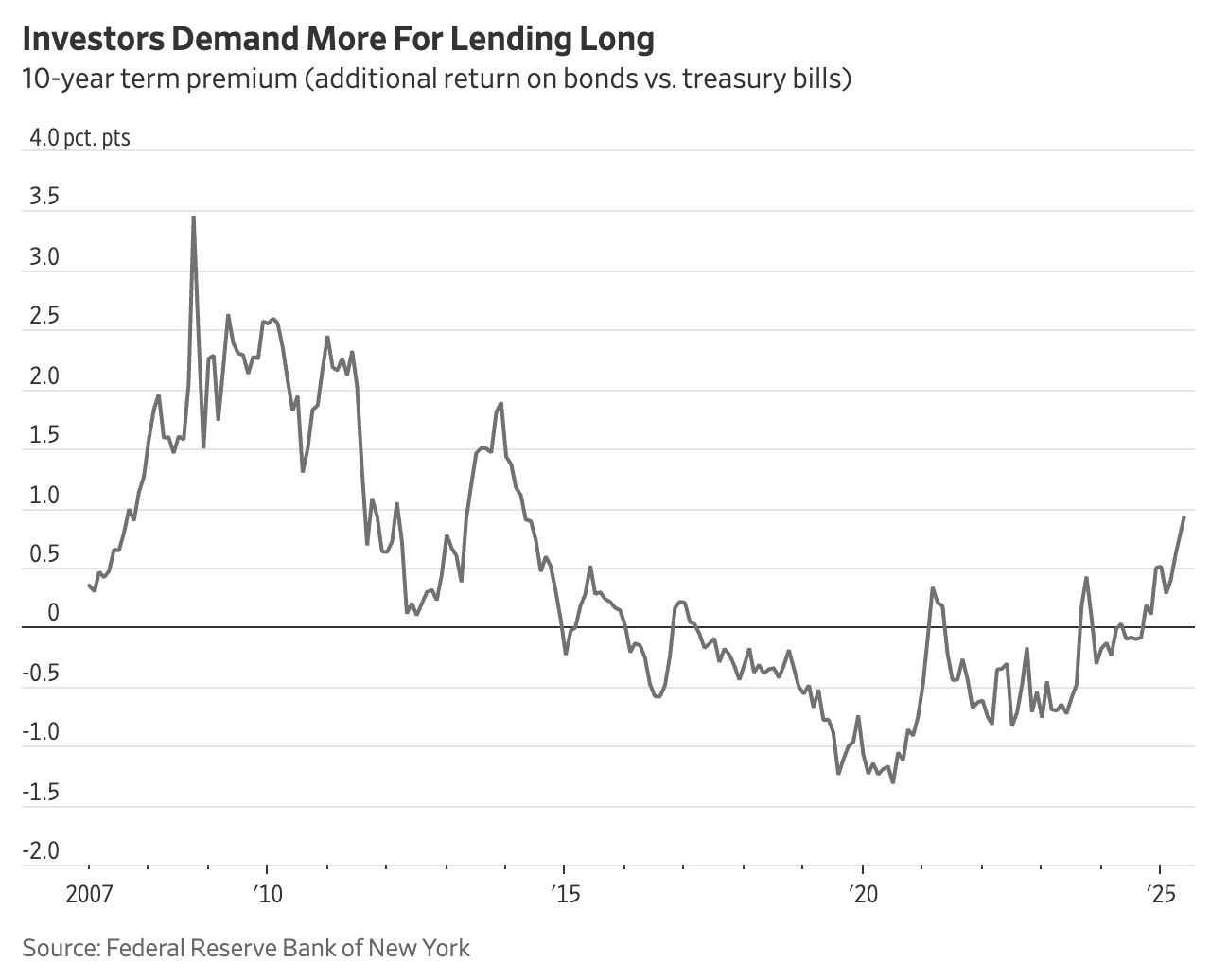 '기간 프리미엄(Term Premium)'은 장기 채권이 단기 채권보다 더 높은 수익률을 제공하는 것이 정상이라는 금융시장의 기본 원칙입니다. 투자자는 돈을 오랜 기간 묶는 대신 더 많은 보상을 기대하기 마련이죠. 그러나 2016년부터 2024년까지 약 8년간 이 상식이 깨졌습니다. 연준의 제로금리 정책과 양적완화, 글로벌 저축 과잉(savings glut), 그리고 팬데믹 충격으로 인한 안전자산 선호가 겹치면서, 오히려 장기 국채 금리가 단기보다 낮아지는 비정상적인 현상, 즉 '마이너스 기간 프리미엄'이 나타났던 것입니다.