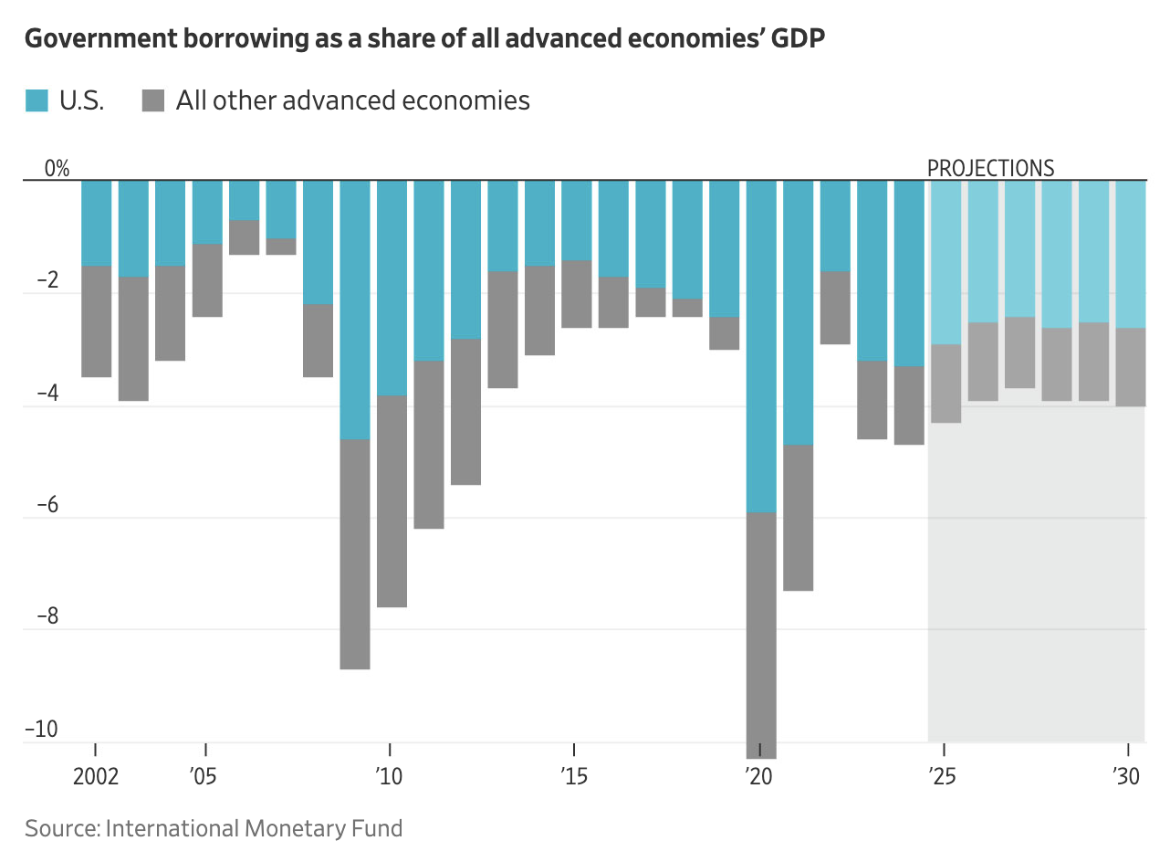 이는 미국 역사상 전례 없는 장기 재정 적자이며, **국제통화기금(IMF)**에 따르면 선진국 전체 재정적자의 3분의 2가 미국에서 발생하게 됩니다.