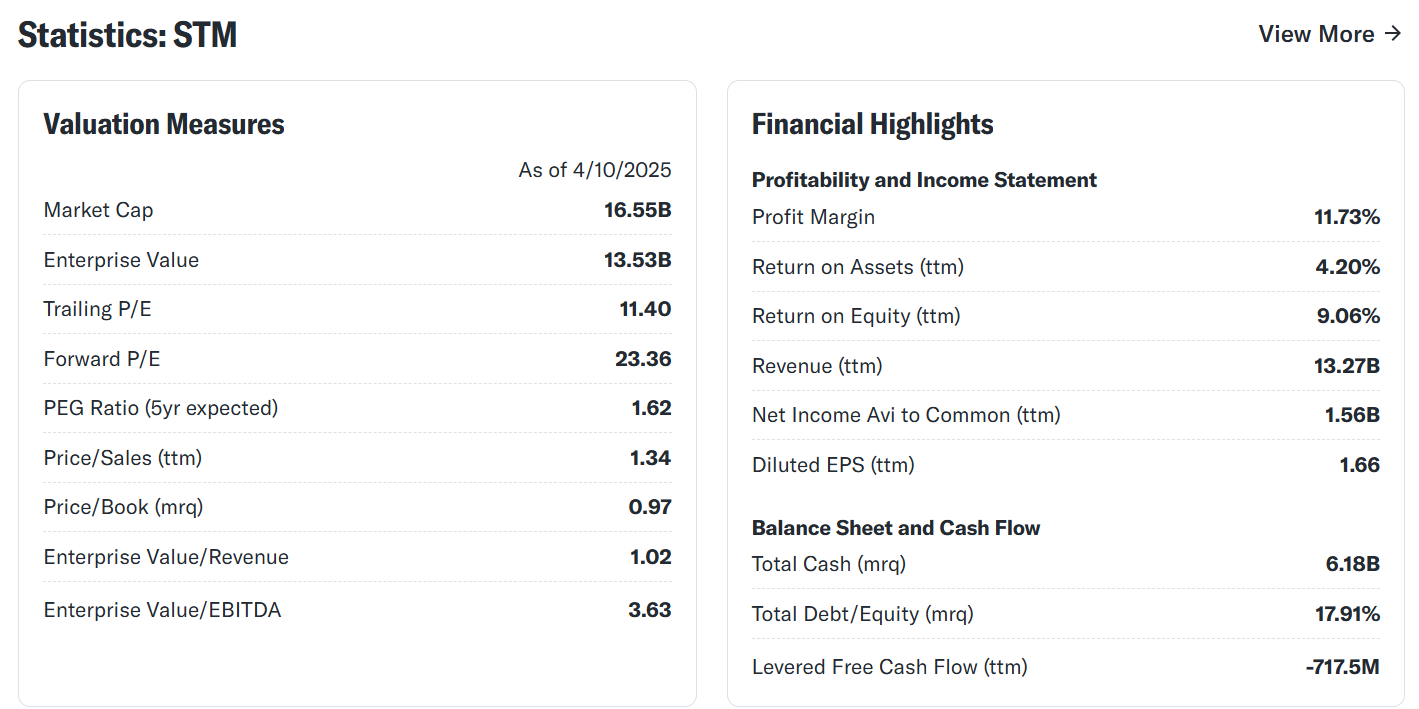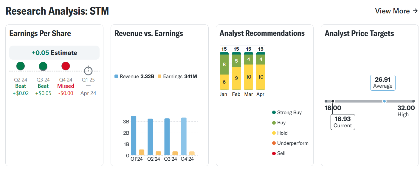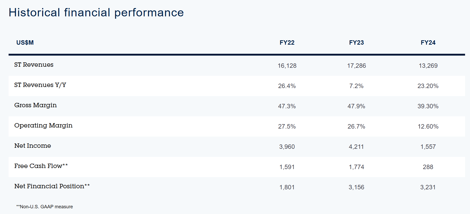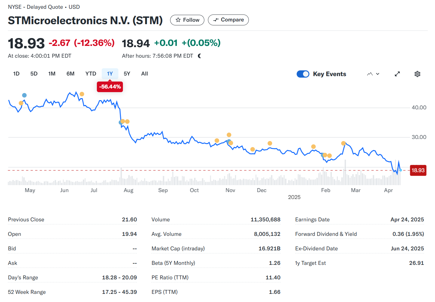 최근 AI 서버와 데이터센터용 고성능 반도체에 대한 수요는 급증하고 있지만, 자동차나 산업 장비 등에서 쓰이는 구형(legacy) 칩에 대한 수요는 급감하고 있습니다. ST 역시 이런 흐름을 피해가지 못했습니다. 회사는 2024년 내내 실적 가이던스를 하향 조정했고, 올해 1분기 매출 예상치는 전년 대비 28% 감소한 25억 1천만 달러로 시장 기대치를 하회했습니다.