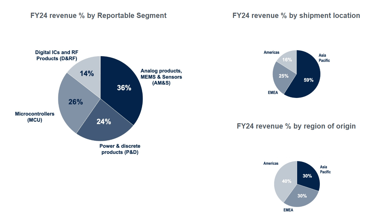 현재 ST는 프랑스와 이탈리아 정부가 합산 약 28%의 지분을 보유하고 있으며, 본사는 스위스 제네바에 위치해 있습니다. 고객사는 애플, 삼성전자, 테슬라 등 글로벌 대표 IT 및 전장(電裝) 기업들로 구성되어 있으며, 산업용 반도체, 전력반도체, 센서 및 MCU 분야에서 강한 경쟁력을 보유해왔습니다.