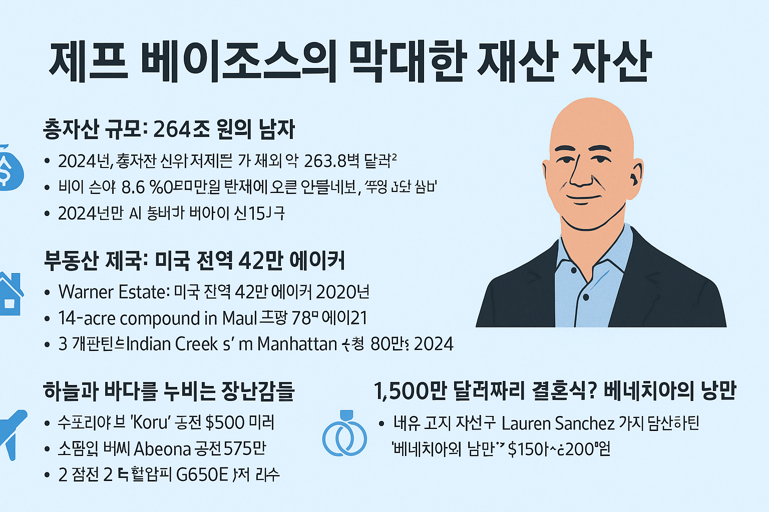 지금의 베이조스는 단순한 ‘부자’를 넘어서, 지구상에서 가장 많은 영향력을 가진 자산가 중 한 사람입니다. 아마존의 지분, 블루 오리진의 우주 개발, 고급 부동산 포트폴리오, 슈퍼요트, 전용기, 그리고 초호화 결혼식까지—그의 자산은 그가 걸어온 성공의 궤적이자, 현대 자본주의의 얼굴입니다.