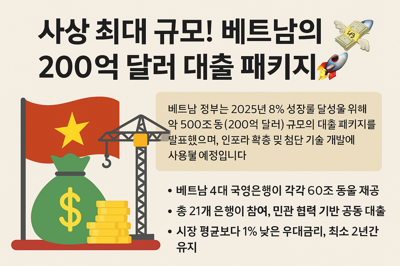 베트남 정부는 2025년 경제성장률을 **8%**로 끌어올리겠다는 목표를 세우고, 이를 달성하기 위한 강력한 자금 지원책으로 사상 최대 규모의 500조 동(약 200억 달러) 대출 패키지를 발표했습니다. 이 자금은 인프라 확충과 첨단 기술 개발에 집중 투자될 예정으로, 그 규모와 구조 모두에서 베트남 금융 역사상 전례 없는 시도입니다.