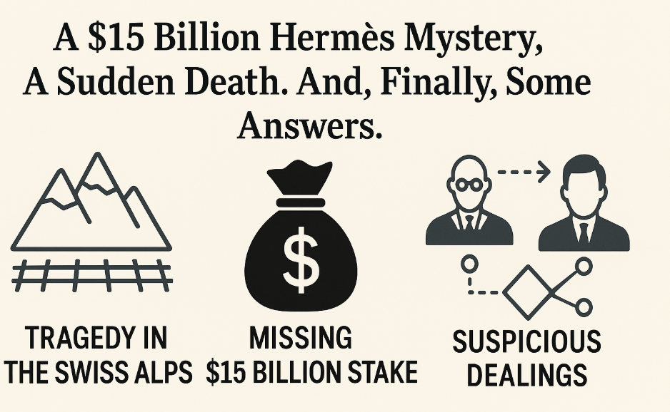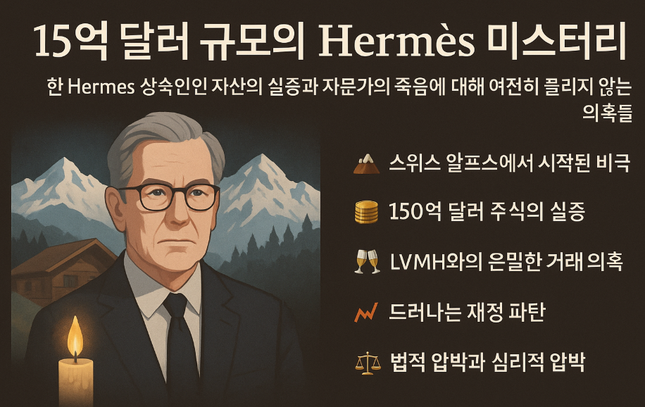 스위스 알프스의 고즈넉한 마을에서 시작된 한 금융인의 갑작스러운 죽음이, 전 세계 명품 업계와 금융계를 뒤흔들고 있습니다. 사건의 중심에는 **에르메스(Hermès) 가문의 5세대 상속인 니콜라 푀슈(Nicolas Puech)**와 그의 오랜 재정 고문 **에릭 프레이몽(Eric Freymond)**이 있습니다.