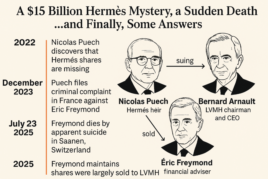 이 사건은 단순한 재산 분쟁이 아니라, **루이비통모에헤네시(LVMH)**의 베르나르 아르노 회장이 2000년대 초부터 벌인 에르메스 지분 매집 작전과 얽혀 있다는 점에서 국제 금융계와 명품 업계를 뒤흔든 미스터리로 꼽힙니다.