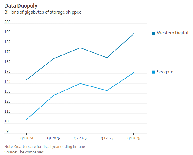 또한 HDD 시장은 사실상 시게이트·웨스턴디지털의 양강 체제로, 도시바가 소규모로 참여하는 독점적 구도를 형성하고 있습니다. 공급자 수가 제한적이라는 점은 가격 협상력을 높이고, 안정적 마진 구조를 가능하게 합니다. 이미 양사의 총이익률은 최근 2년 사이 두 배 가까이 올라 40% 안팎을 기록하고 있습니다. 이는 과거 가격 경쟁과 공급 과잉에 시달리던 HDD 업계에서는 찾아보기 힘들었던 수준입니다.