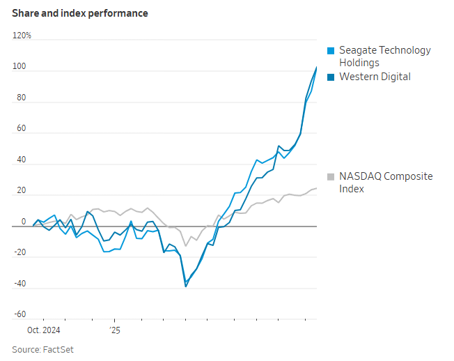 엔비디아나 오픈AI 같은 화려한 이름 뒤에서, ‘구시대의 유물’이라 불리던 하드디스크가 뜻밖의 전성기를 맞고 있습니다. 웨스턴디지털(Western Digital)과 시게이트(Seagate) 두 대형 제조업체는 최근 분기 매출이 전년 대비 약 30% 증가했습니다. AI의 핵심 연료가 바로 데이터이고, 그 데이터를 담는 ‘그릇’ 역할을 HDD가 충실히 하고 있기 때문입니다.