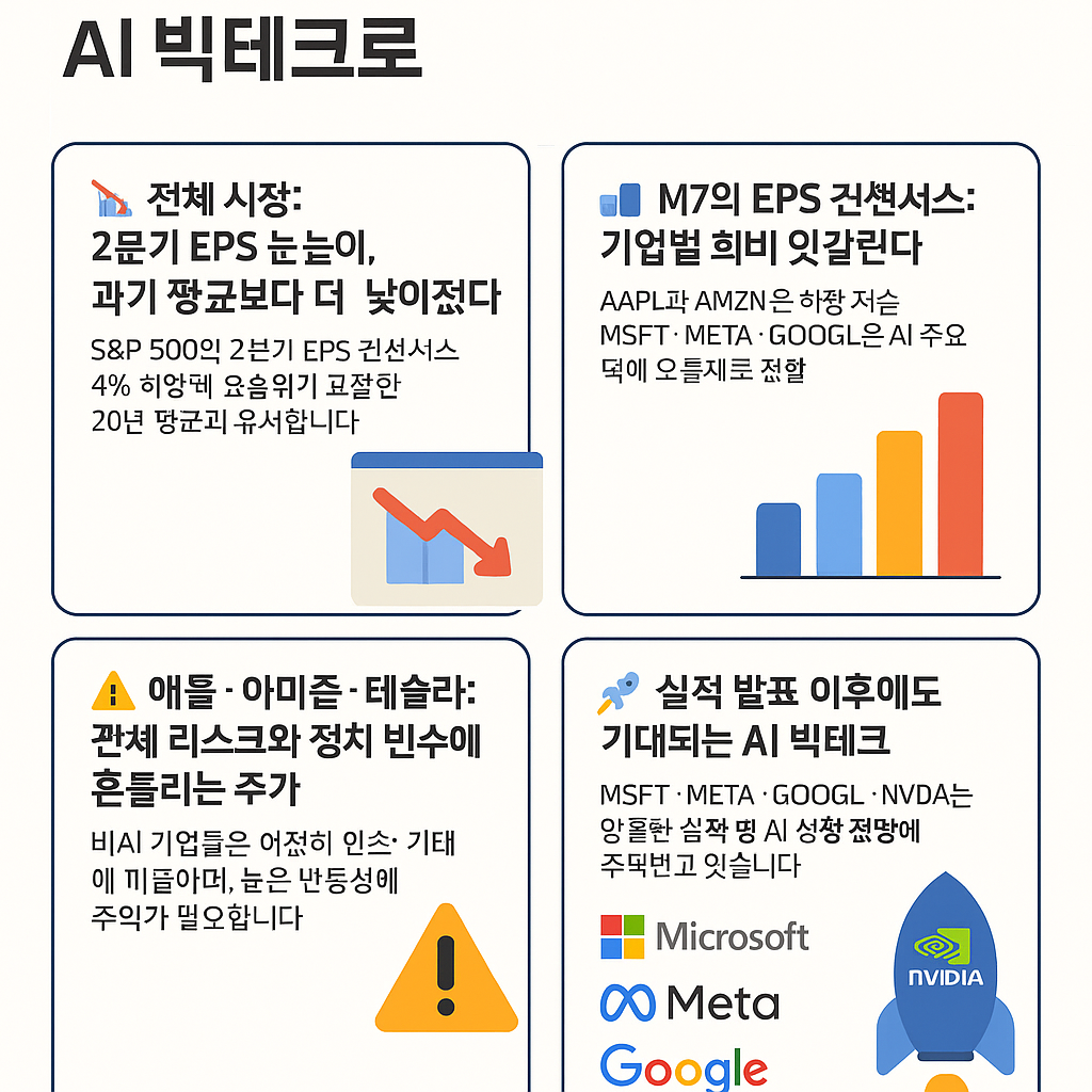 미국 증시의 실적 시즌이 7월 중순부터 본격적으로 시작됩니다. 특히 ‘M7(애플, 아마존, 마이크로소프트, 메타, 구글, 엔비디아, 테슬라)’의 실적 발표가 예정된 7월 말은 시장의 이목이 집중되는 시점입니다. 2분기 들어 S&P 500 전체의 EPS(주당순이익) 컨센서스는 4% 하락하며, 투자자들의 기대는 낮아졌지만 동시에 ‘어떤 기업이 그 낮아진 눈높이를 상회할까’에 관심이 모이고 있습니다. 이번 실적 시즌에서 중요한 키워드는 단연 **“AI와 성장 가시성”**입니다.