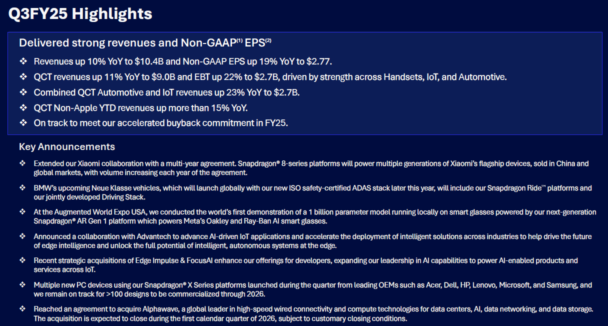 Qualcomm이 발표한 2025 회계연도 4분기 가이던스는 시장의 기대를 완전히 충족시키지는 못했습니다. 실적 자체는 예상보다 나았지만, 향후 분기에 대한 성장 모멘텀에 대한 시장의 ‘갈증’을 해소하지는 못한 것입니다.