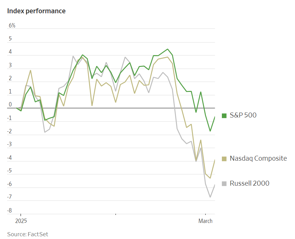 - 나스닥 종합지수(Nasdaq Composite): 2월 중순 이후 7.5% 하락.