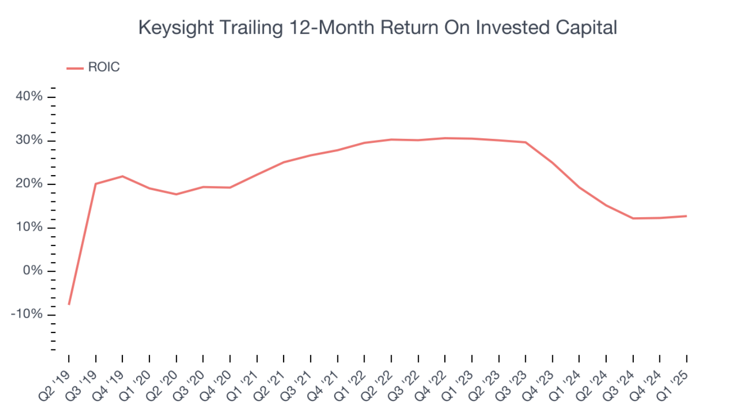 Keysight는 5년간 평균 63%에 달하는 **우수한 매출총이익률(Gross Margin)**을 기록하며, 기술력 기반의 프리미엄 제품 전략을 보여주었습니다. 하지만 영업이익률은 5년간 2.7%p 하락했고, **ROIC(투자자본수익률)**도 점차 감소해 장기적인 수익성에 경고 신호를 보냅니다.