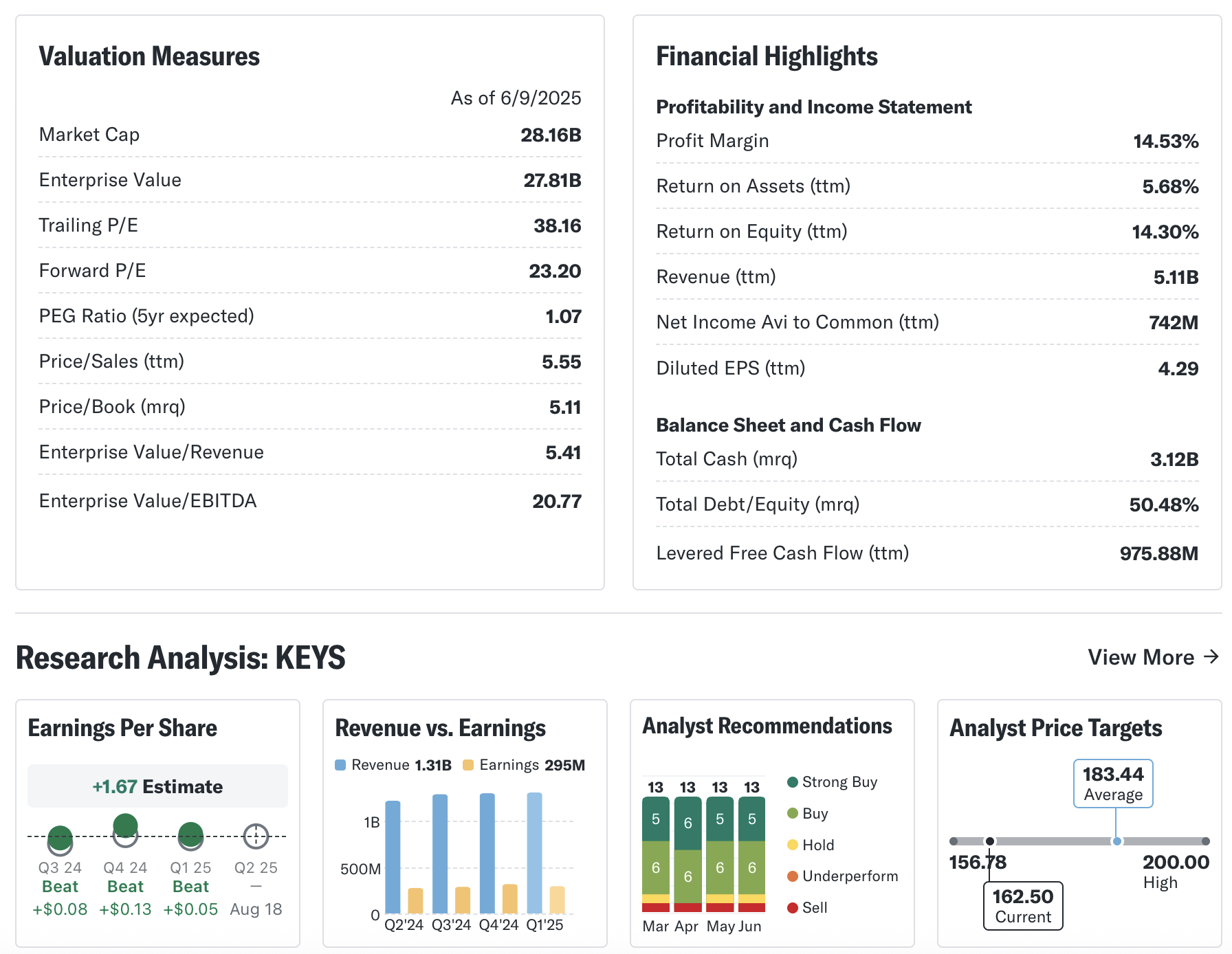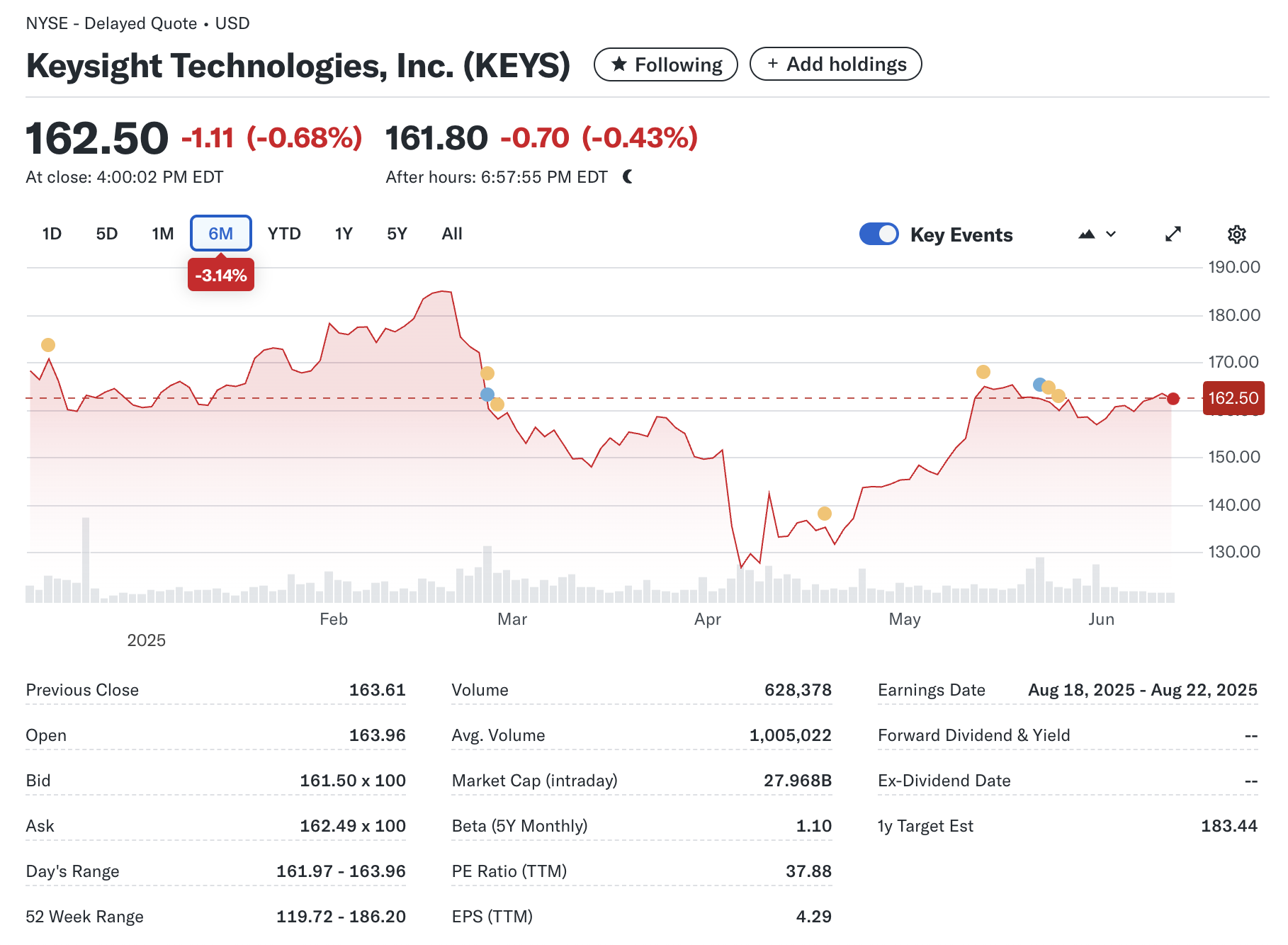 Keysight는 기술 중심 기업으로서 프리미엄을 인정받아왔지만, 최근 들어 그 ‘프리미엄’이 과도하게 반영되고 있는 것이 아닌가 하는 우려가 제기되고 있습니다. 현재 주가는 $163.61 기준으로, 선행 주가수익비율(PER)은 22.5배 수준입니다. 이는 동종 산업 내 평균을 웃도는 수치로, ‘질 좋은 성장’을 선반영한 고평가 영역에 있다는 지적이 나옵니다.