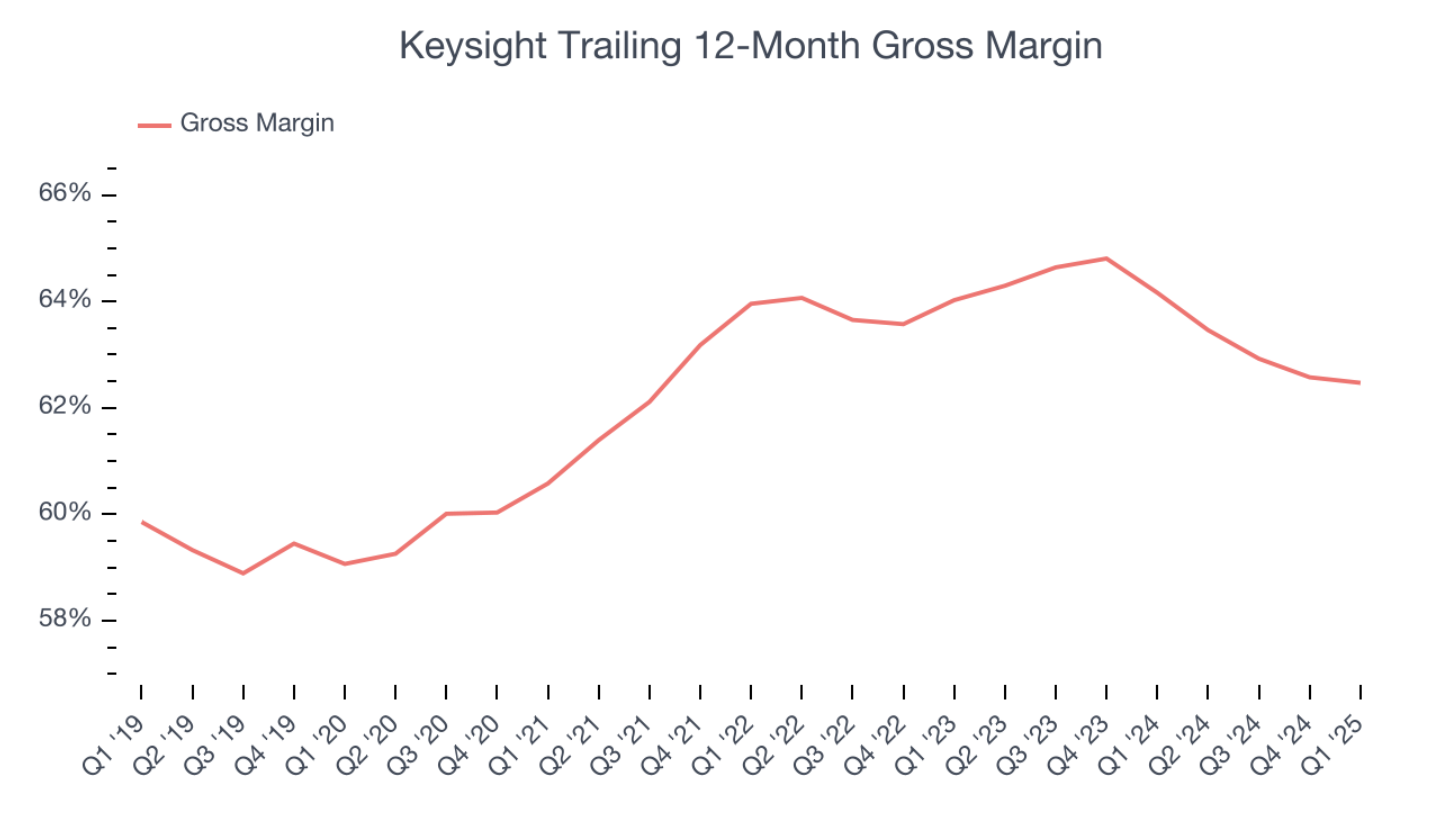 Keysight는 산업계에서 보기 드물게 고마진 구조를 갖춘 회사입니다. 5년 평균 **매출총이익률(Gross Margin)은 63.1%**에 달하며, 이는 동종 산업 내 ‘프리미엄 제품군’을 운영하는 기업임을 보여줍니다. 이번 분기에도 62.3%를 기록하며 견조한 수준을 유지했습니다. 이러한 높은 마진은 R&D와 고급 기술인력을 유지하는 데 있어 안정적인 기반이 되어줍니다.