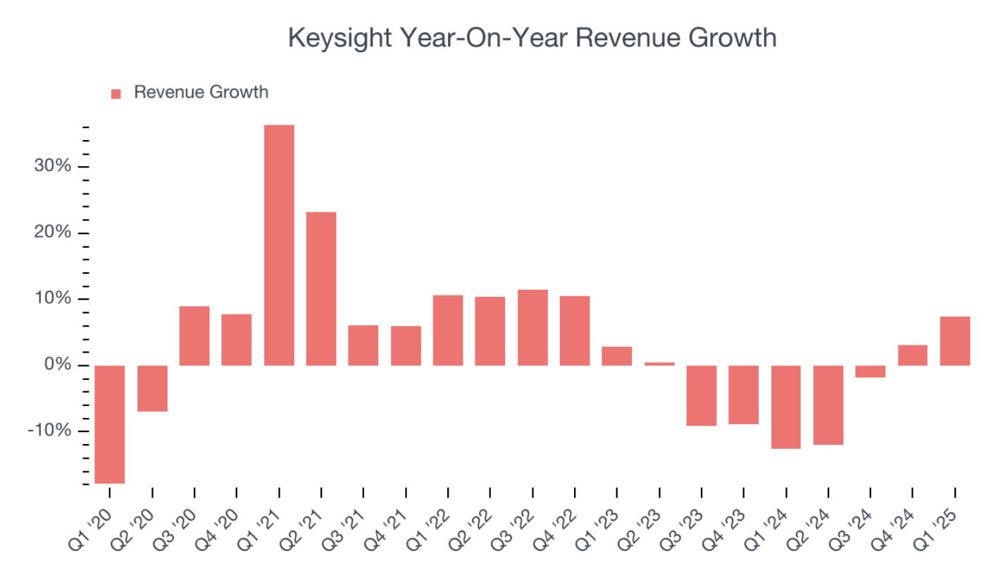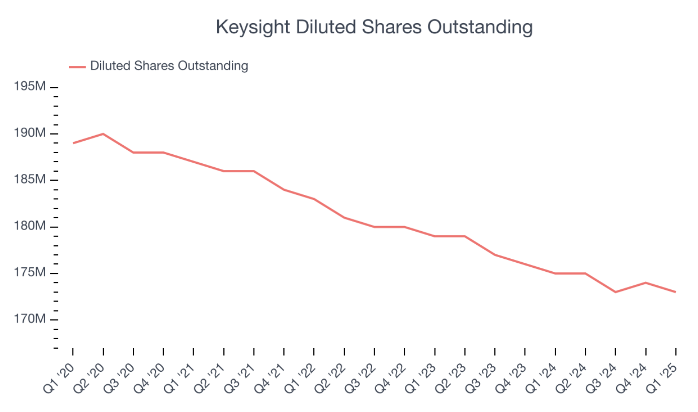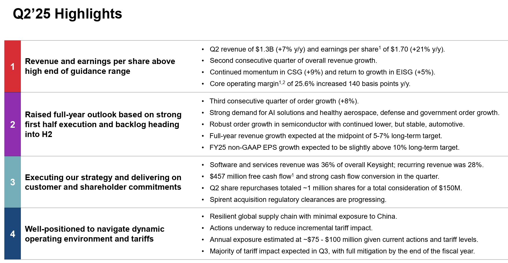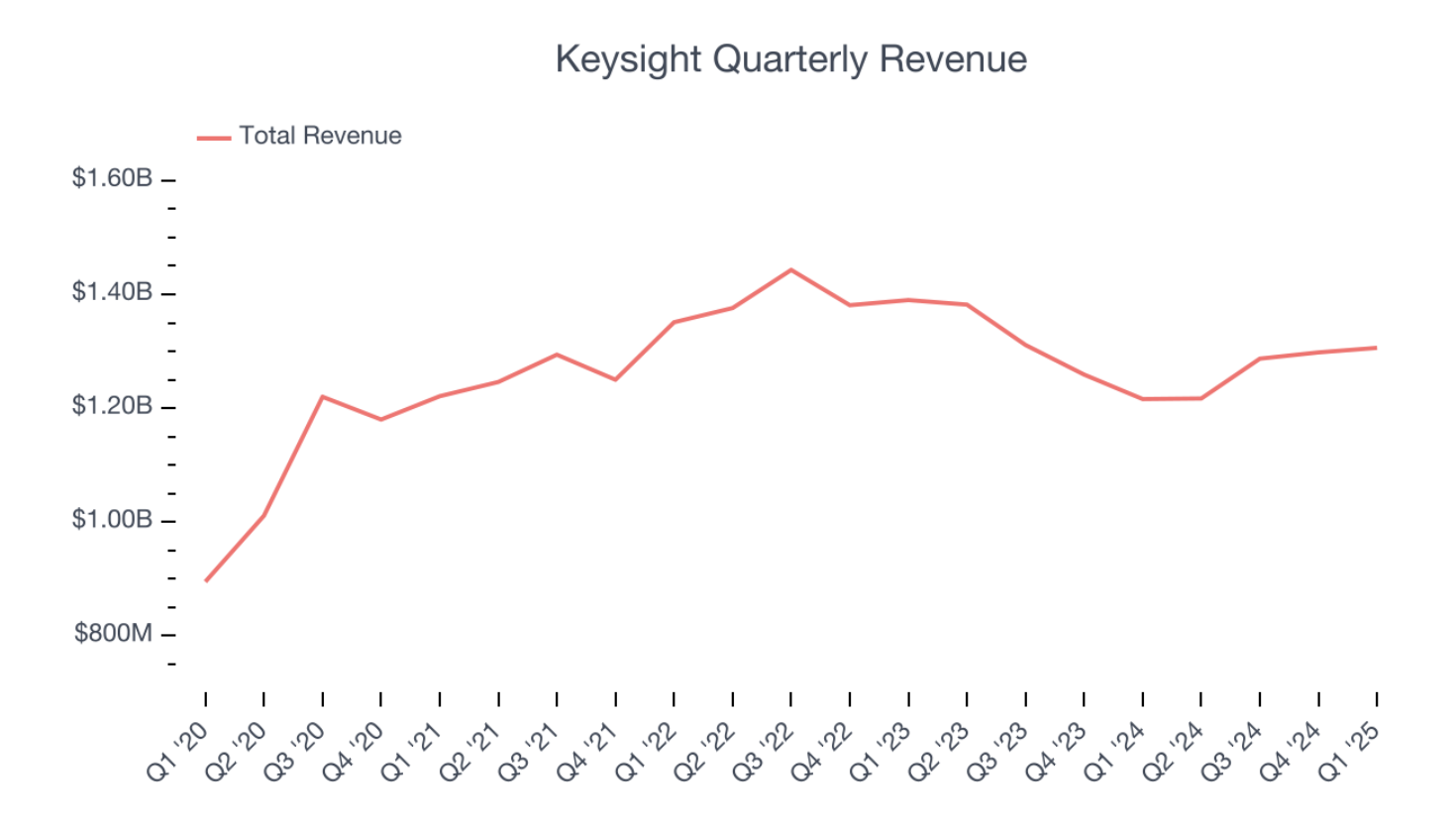 2025년 1분기 실적에서 Keysight는 시장의 기대를 상회하는 성과를 기록했습니다. 매출은 13.1억 달러로 전년 대비 7.4% 성장했으며, 이는 월가 예상치(12.8억 달러)를 1.8% 상회하는 수치입니다. 조정 주당순이익(EPS)은 $1.70으로, 역시 예상치($1.65)를 3.3% 웃돌았습니다.