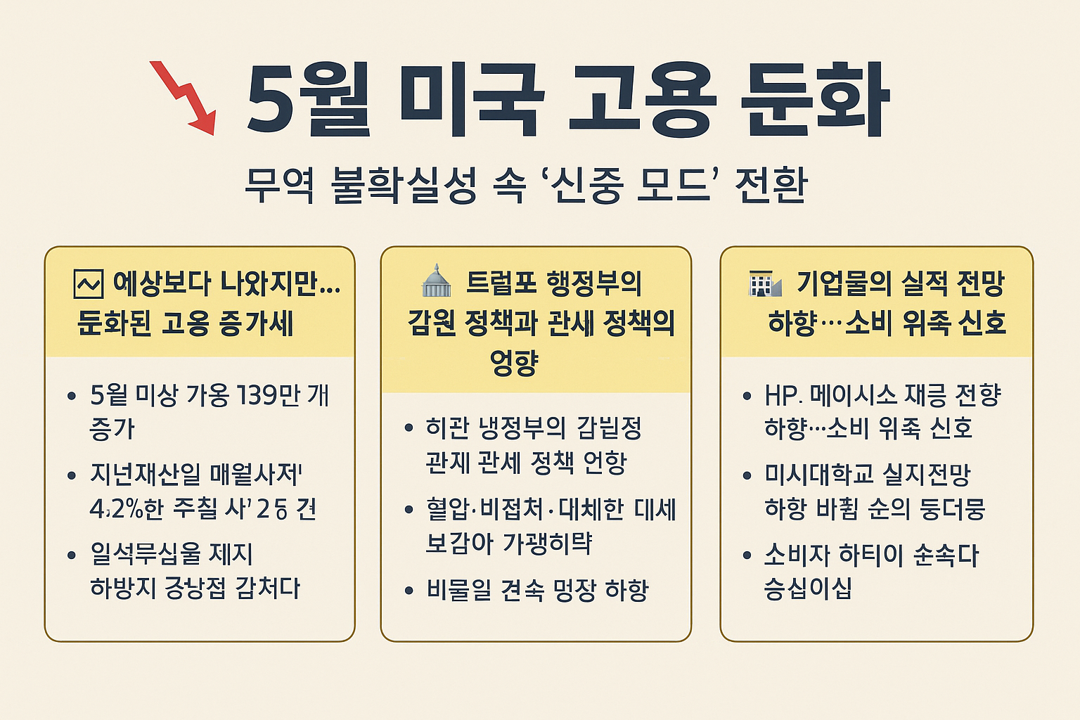 이번 5월 고용지표는 단순한 숫자 그 이상의 메시지를 담고 있습니다. 표면적으로는 여전히 안정적인 경제처럼 보이지만, 자세히 들여다보면 고용 창출은 둔화되고, 기업의 투자와 소비자의 지출은 점점 위축되고 있습니다.