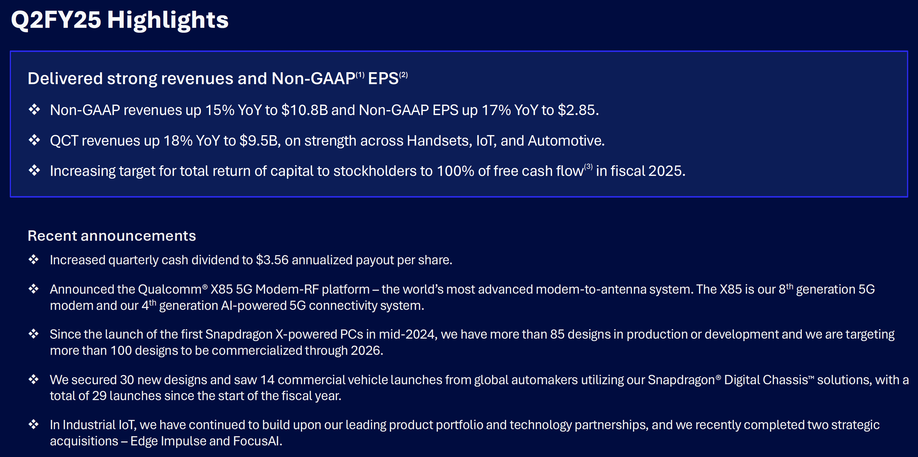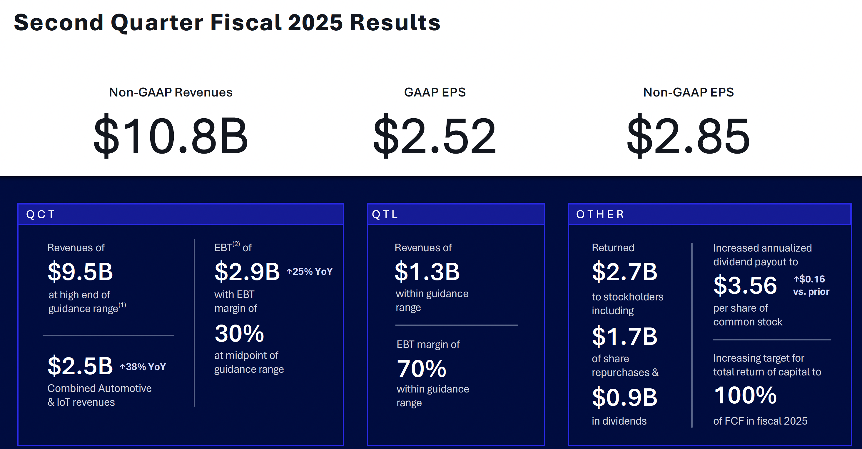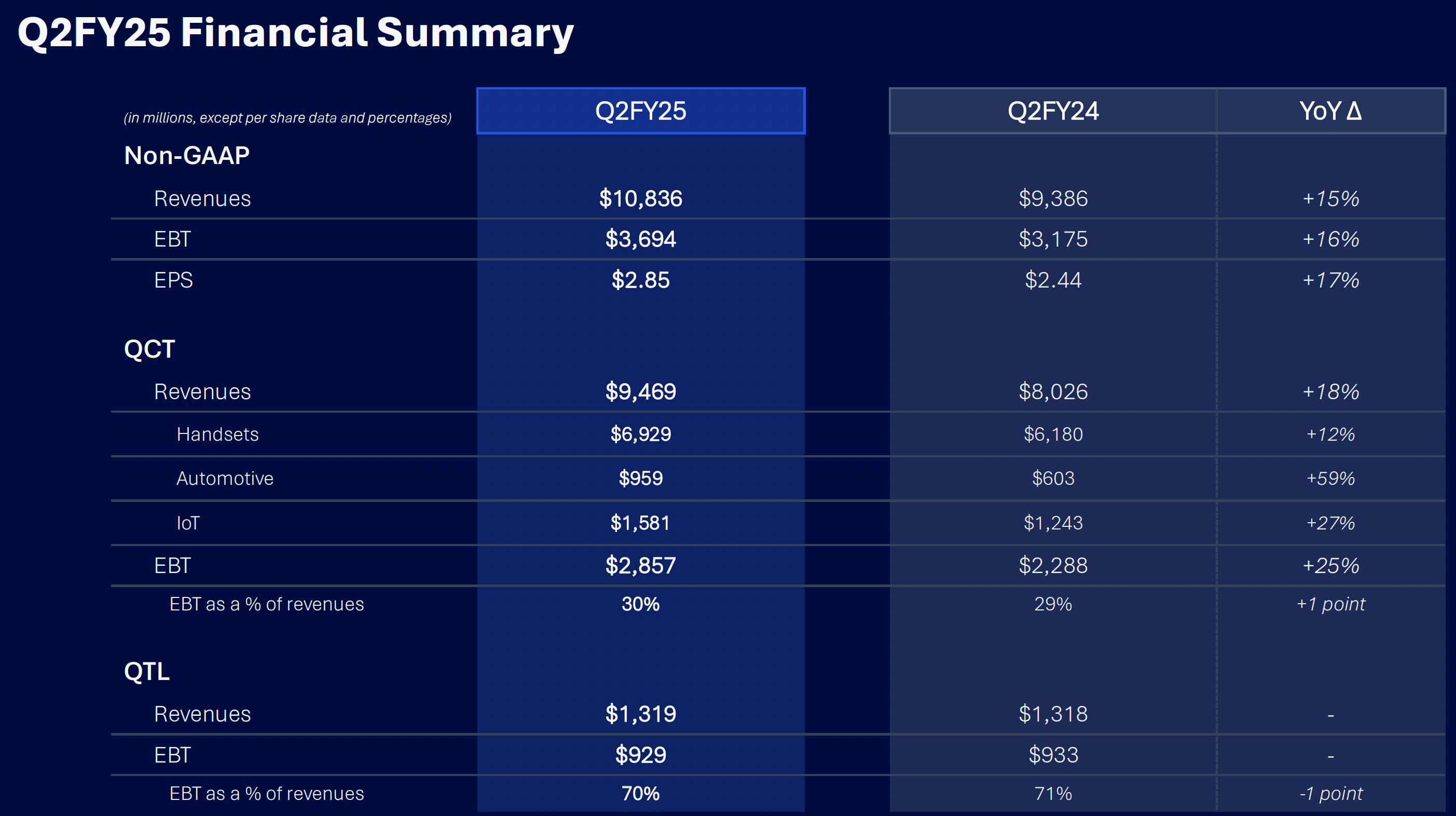 퀄컴(Qualcomm)은 2025 회계연도 2분기에 다시 한 번 투자자들의 기대를 넘어서는 성적표를 내놓았습니다. 비일반회계기준(Non-GAAP) 매출은 108억 달러로 전년 대비 15% 증가, 이는 애널리스트 컨센서스와 가이던스 중간값을 모두 상회한 수치입니다. 비일반회계기준 주당순이익(EPS)도 2.85달러로 17% 증가, 마찬가지로 시장 기대치를 웃돌았습니다.
