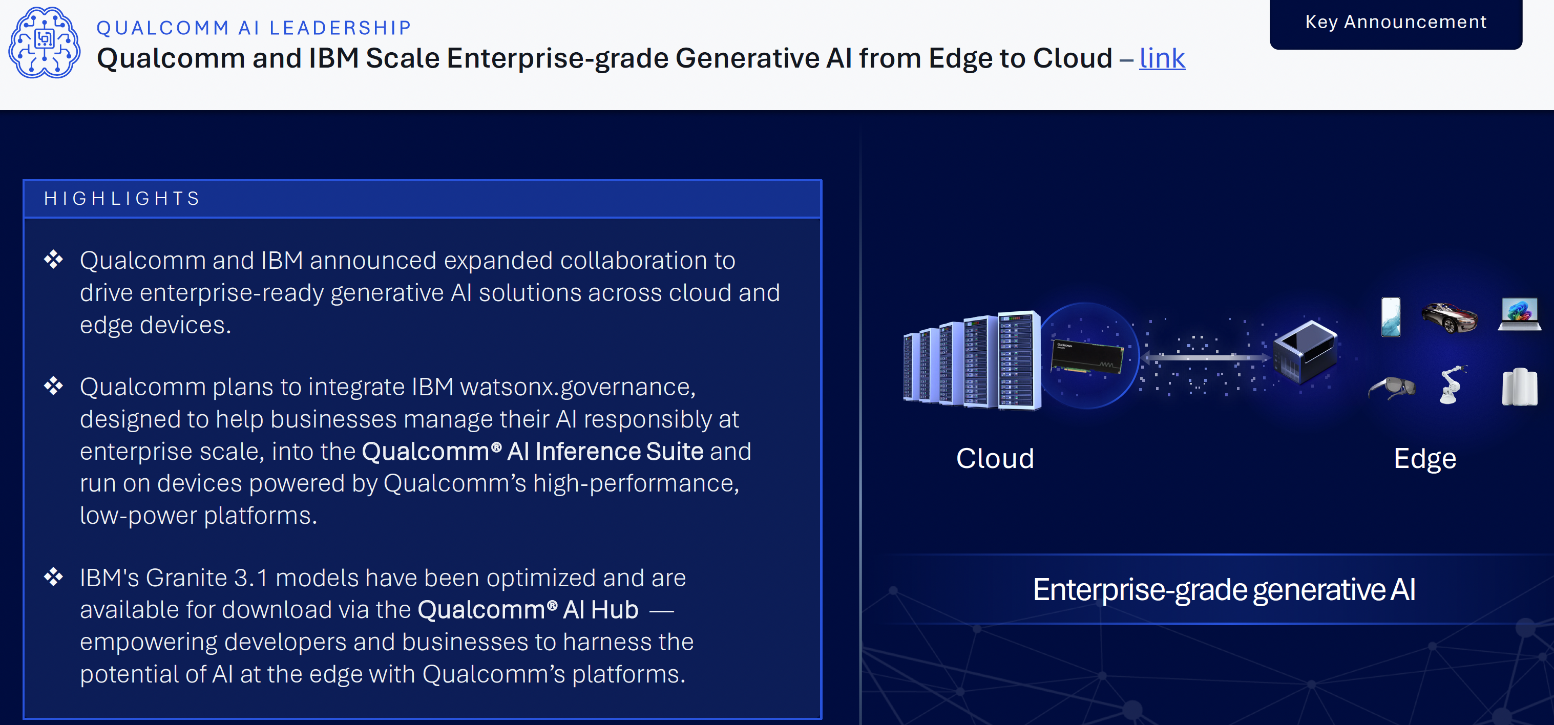 이외에도 IBM의 watsonx.governance를 퀄컴 AI Inference Suite에 통합하고, Palantir의 Ontology 시스템과 협력하여 산업용 엣지 컴퓨팅 분야에서도 엔터프라이즈급 AI 관리 및 분석 기능을 구현하고 있습니다. 이처럼 퀄컴은 단순한 칩셋 제조사를 넘어서, 산업 전반의 AI 파트너로 진화 중입니다.
