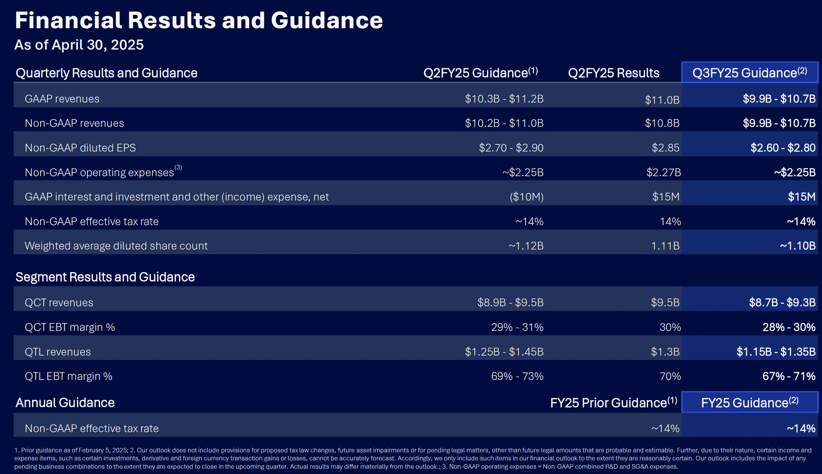 퀄컴(Qualcomm)은 2025 회계연도 2분기에 비일반회계기준(Non-GAAP) 매출 108억 달러, 주당순이익(EPS) 2.85달러를 기록하며 시장 기대치를 웃도는 견조한 실적을 발표했습니다. 전년 동기 대비 각각 15%, 17% 증가한 수치이며, GAAP 기준 매출은 110억 달러, EPS는 2.52달러였습니다.