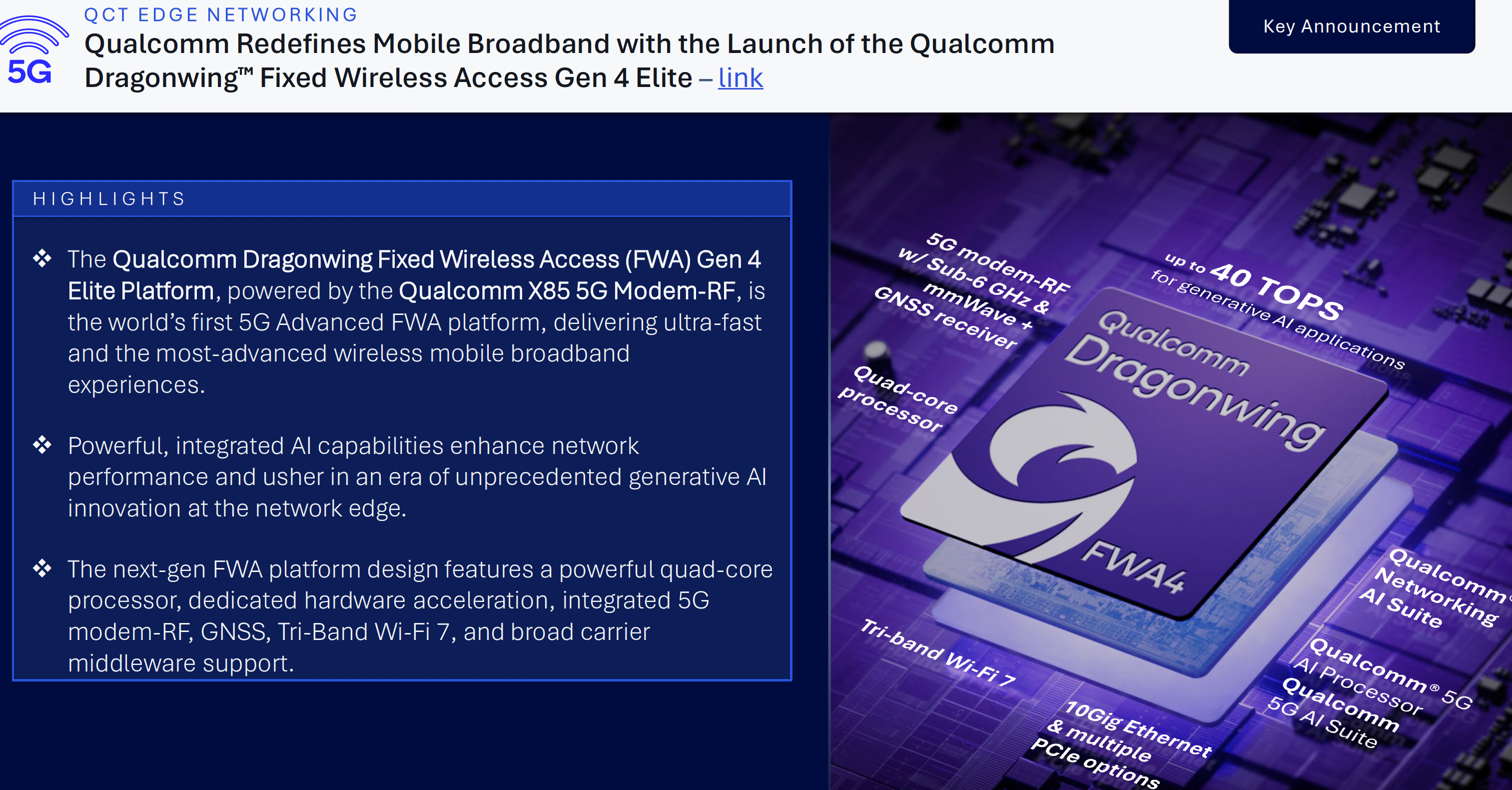 - Dragonwing FWA Gen 4 Elite: 세계 최초의 5G Advanced 기반 고정 무선 액세스 플랫폼