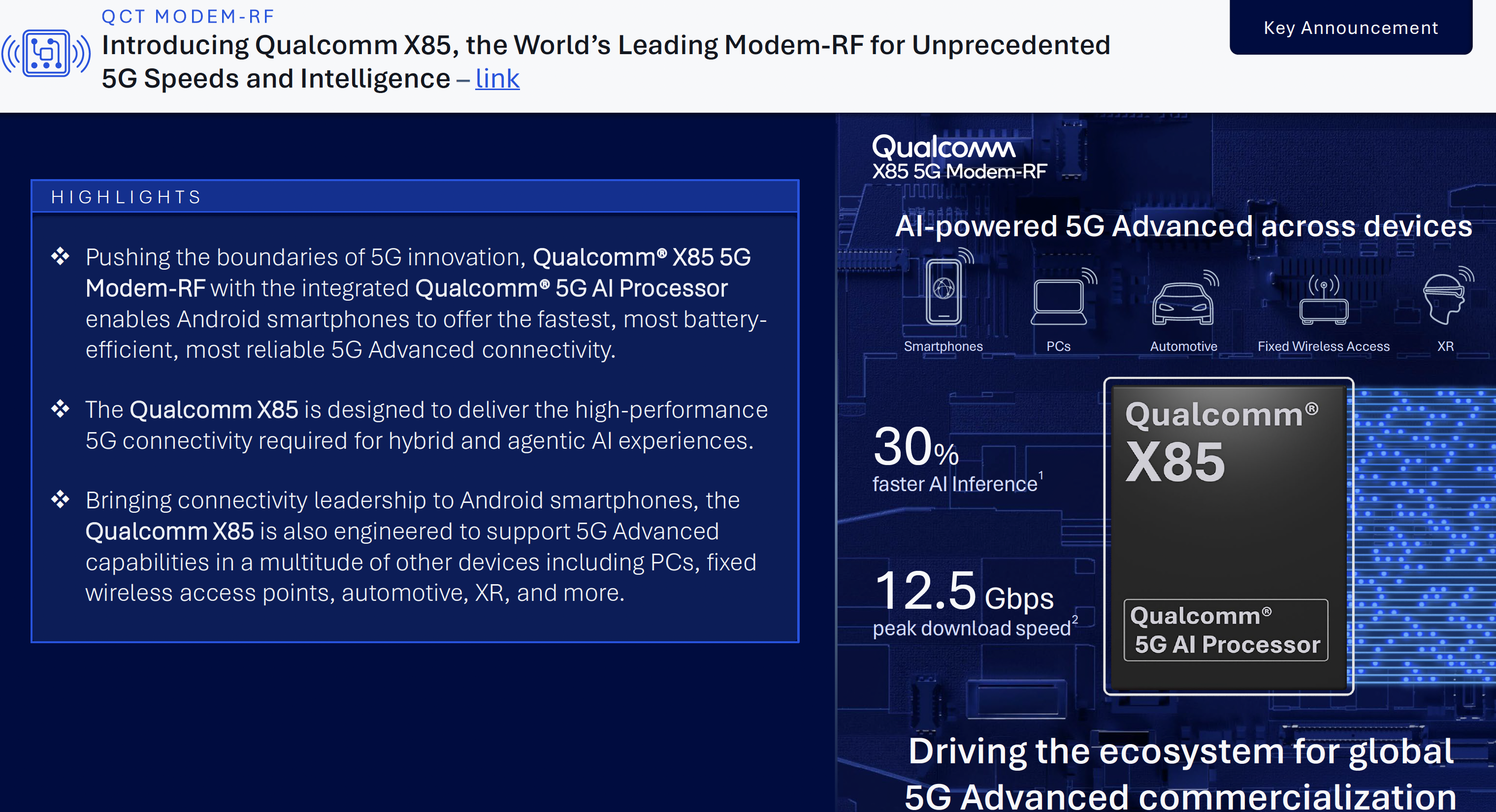 - Qualcomm X85 5G Modem-RF: 세계 최초의 AI 기반 5G Advanced 모뎀-안테나 시스템. 최대 12.5Gbps 속도 제공