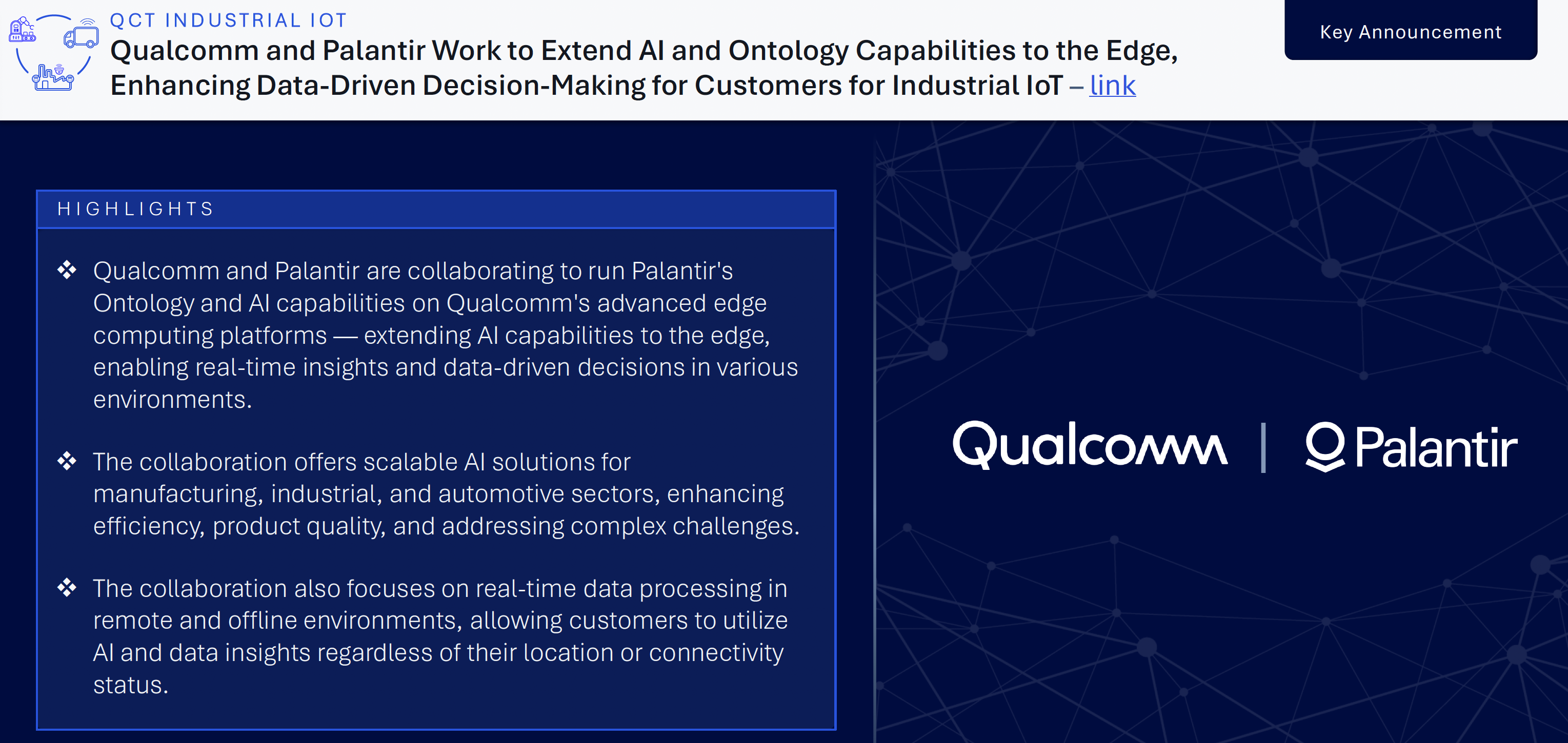 퀄컴과 Palantir는 Ontological AI 플랫폼을 퀄컴의 고성능 엣지 컴퓨팅 칩에 통합하여, 산업 현장이나 원격 환경에서도 실시간으로 AI 분석 및 의사결정을 가능하게 하는 솔루션을 공동 개발하고 있습니다.