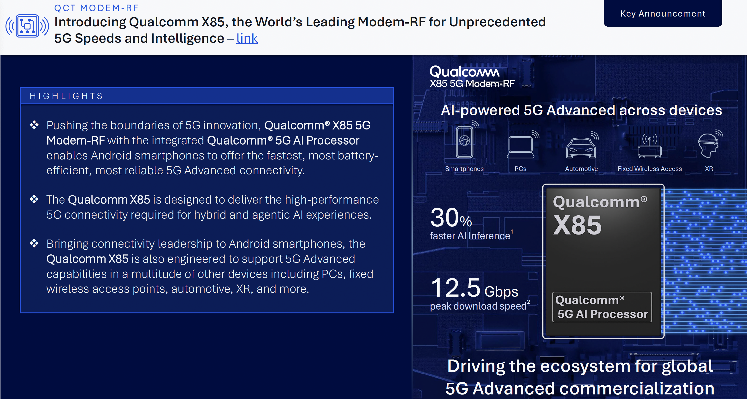 - 5G & AI: 세계 최초 AI 기반 5G Advanced 모뎀 ‘X85’ 공개. 30% 빠른 AI 추론 성능으로 주목.